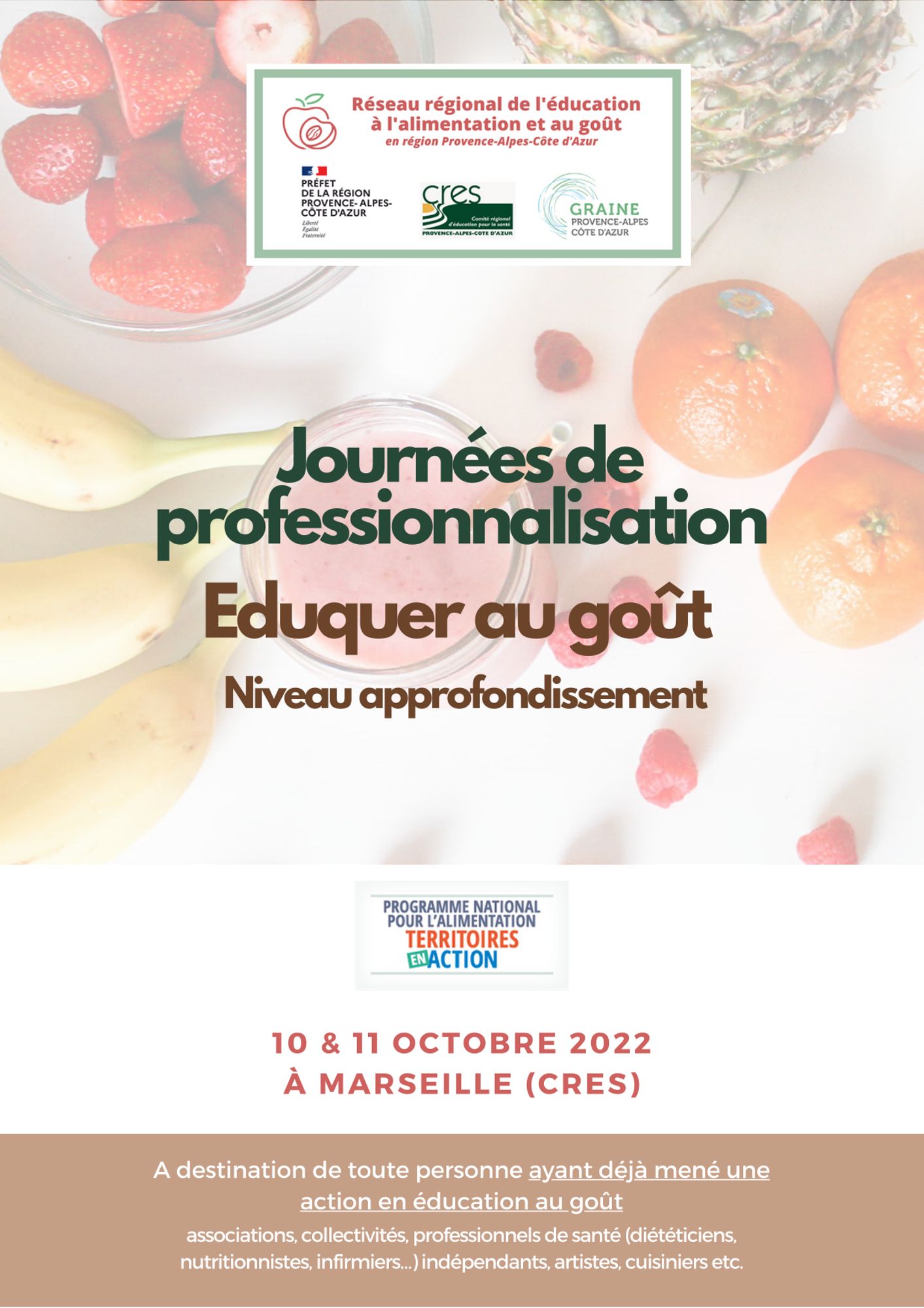 Le CRES et le GRAINE, en partenariat et avec le soutien financier de la DRAAF Provence-Alpes-Côte d’Azur, proposent deux journées de professionnalisation "Eduquer au goût – niveau approfondissement" , dans le cadre du Réseau régional de l’éducation à l’alimentation et au goût.