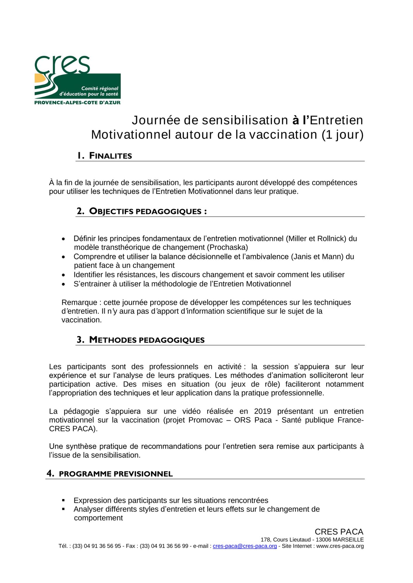 Le CRES organise une journée de sensibilisation à l'entretien motivationnel en vaccination, le 14 mars 2024, de 9h00 à 17h00, dans ses locaux, 178 Cours Lieutaud à Marseille, animée par Pierre Sonnier, formateur et pharmacien.