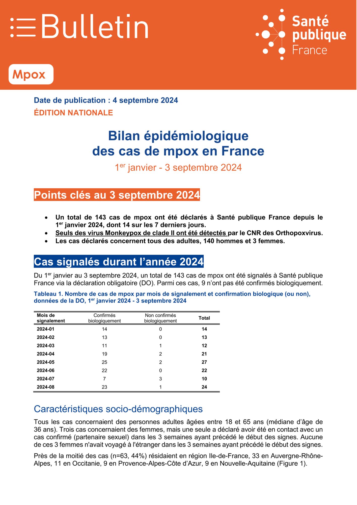 - Un total de 143 cas de mpox ont été déclarés à Santé publique France depuis le 1er janvier 2024, dont 14 sur les 7 derniers jours.