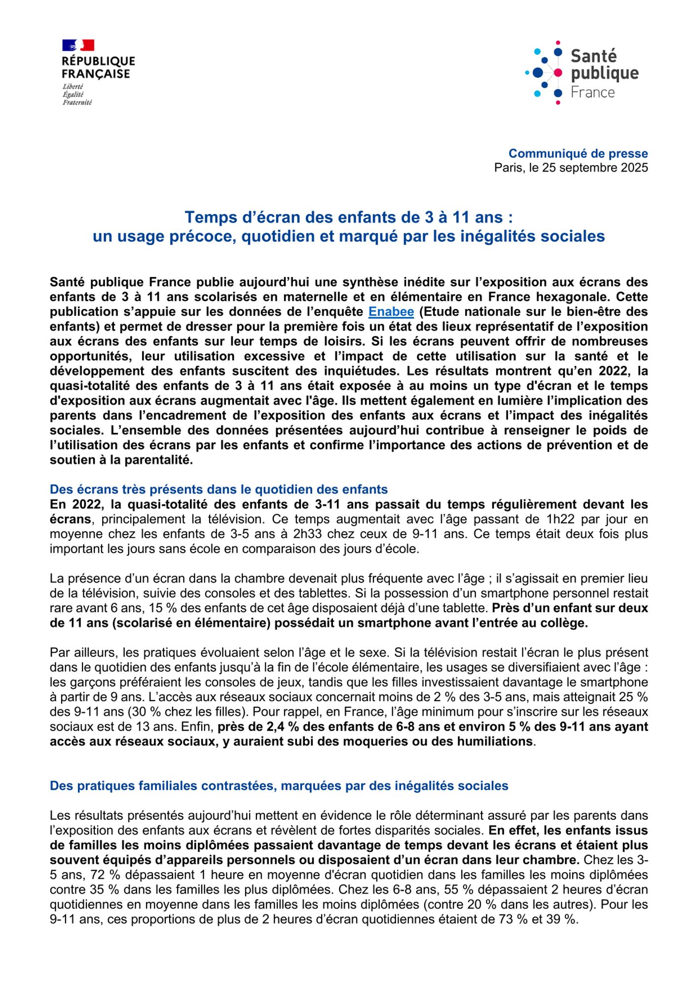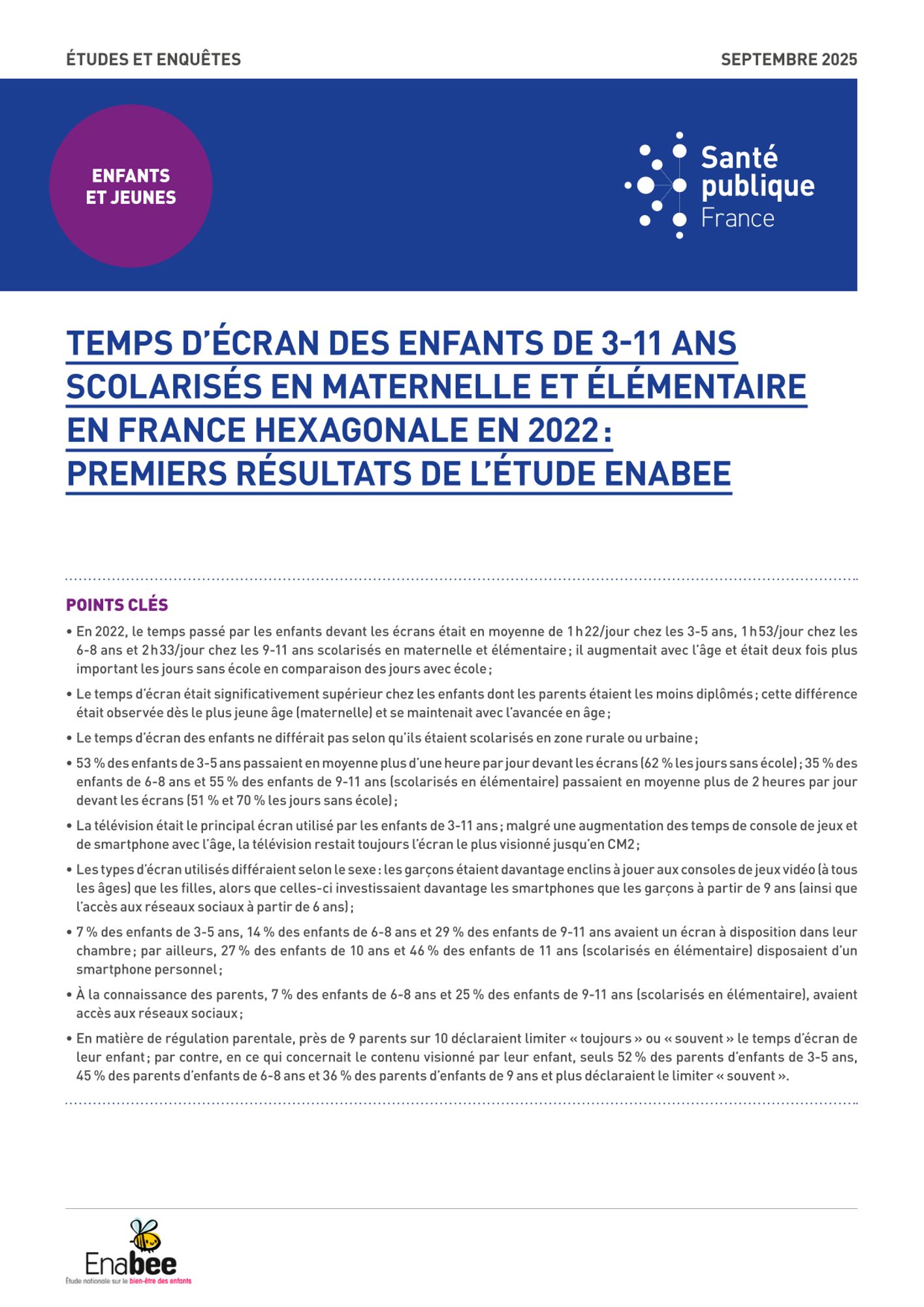 Santé publique France publie une synthèse inédite issue de l’enquête Enabee (Étude nationale sur le bien-être des enfants) qui dresse, pour la première fois, un état des lieux représentatif de l’exposition aux écrans des enfants de 3 à 11 ans scolarisés en France.
