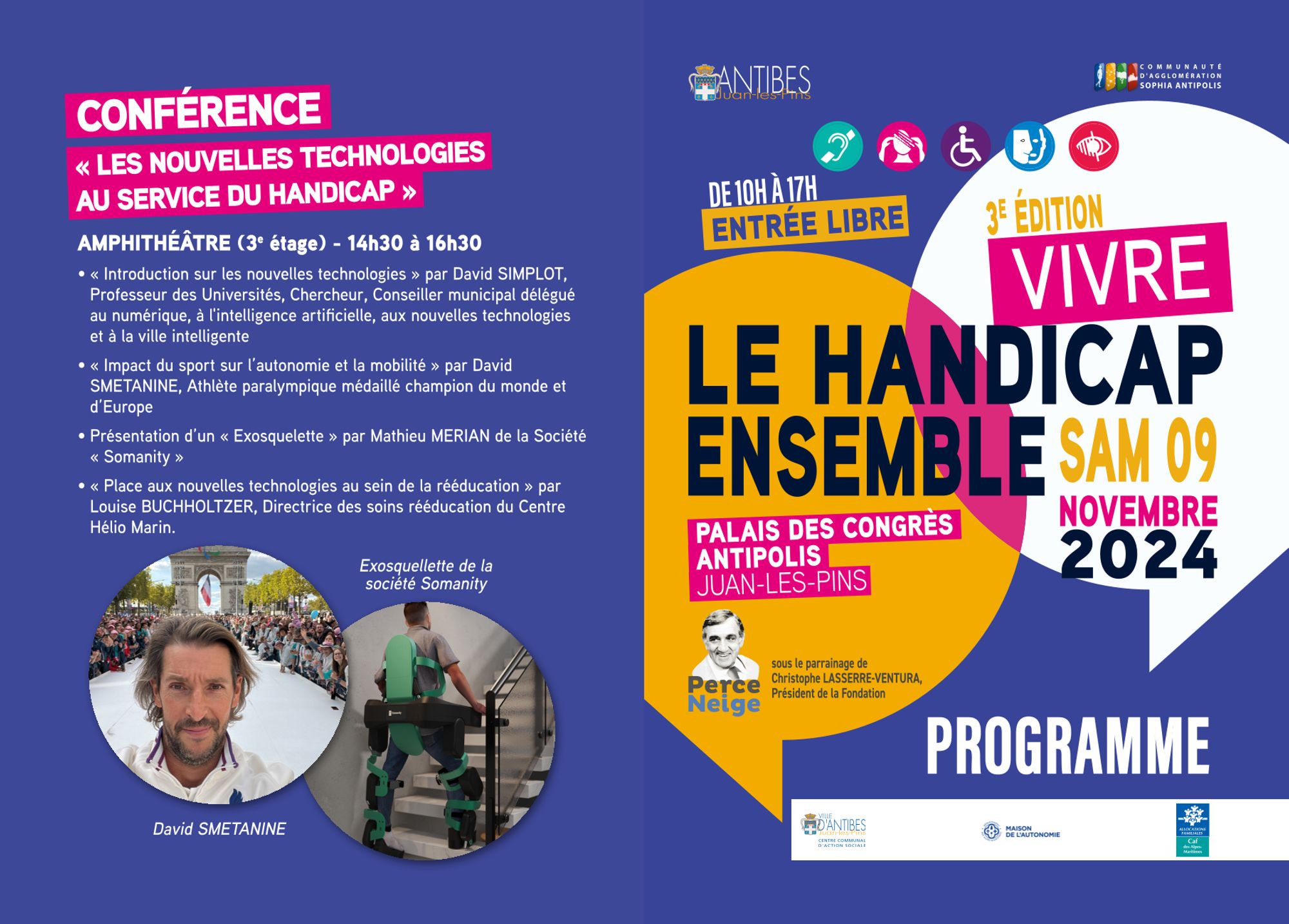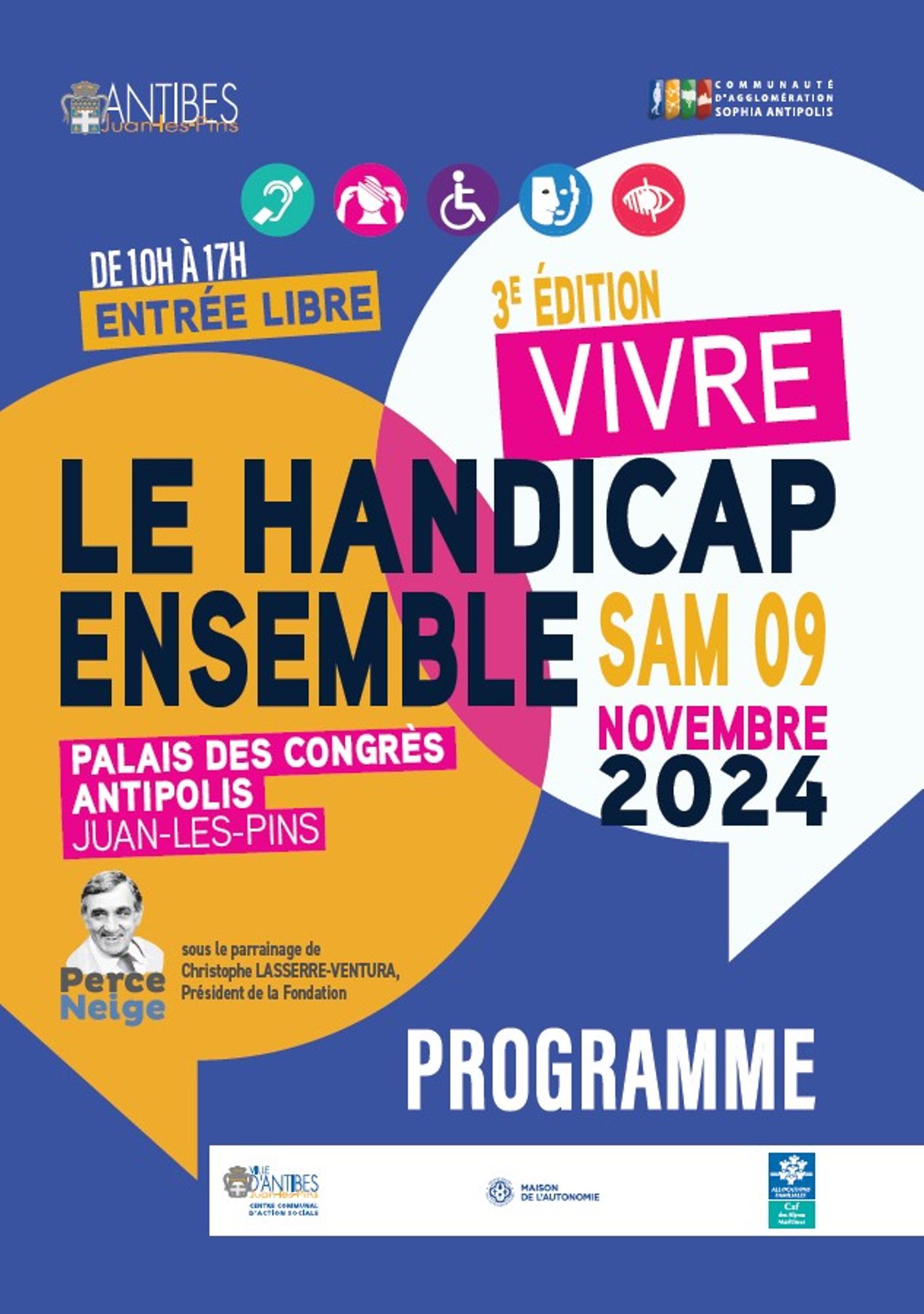 Veuillez trouver ci-joint, le Programme du Forum « Vivre le handicap ensemble » 3ème édition, qui aura lieu le samedi 09 novembre 2024 au Palais des Congrès Antipolis à Juan-les-Pins.