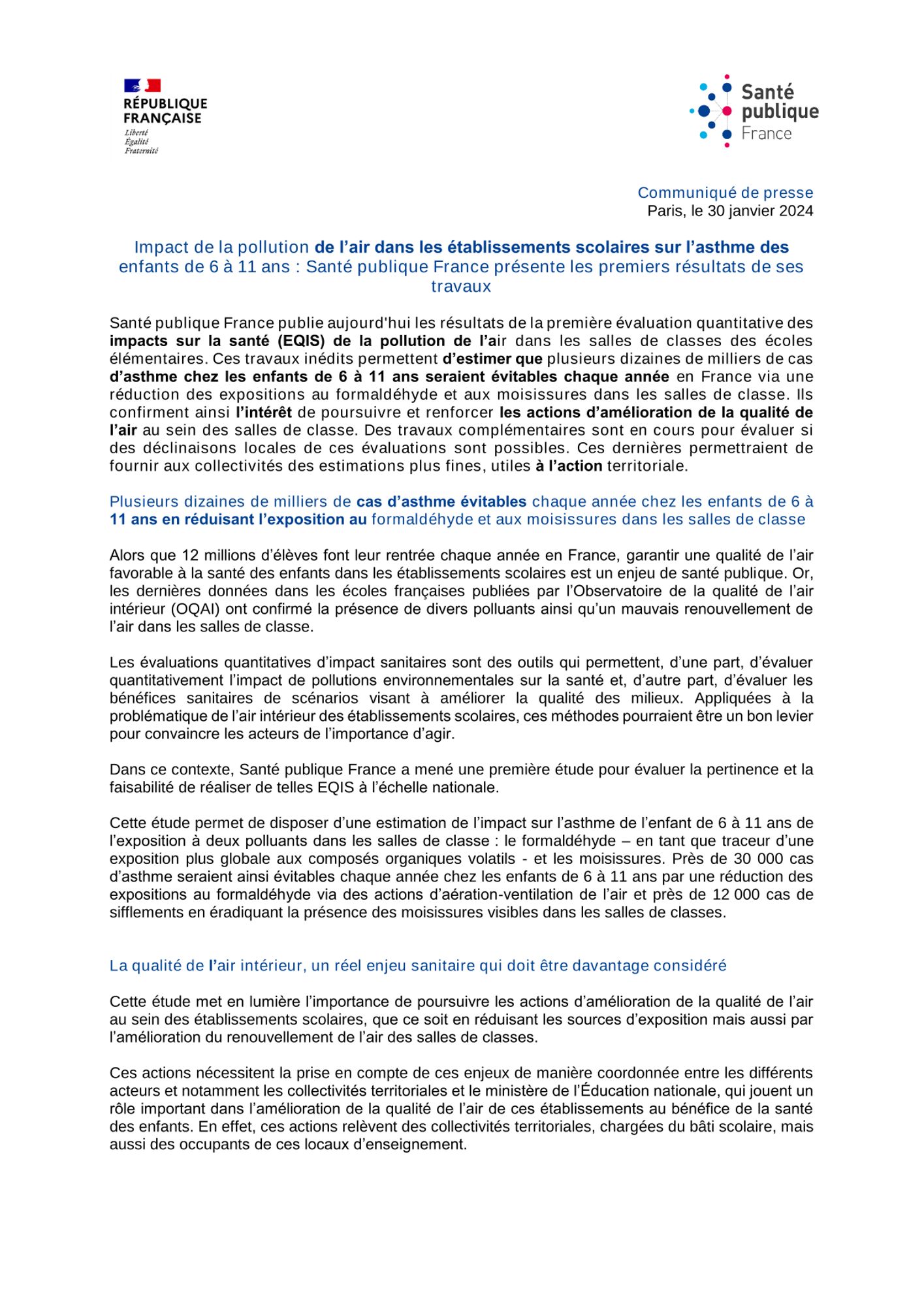 Santé publique France publie aujourd'hui les résultats de la première évaluation quantitative des impacts sur la santé (EQIS) de la pollution de l’air dans les salles de classes des écoles élémentaires. Ces travaux inédits permettent d’estimer que plusieurs dizaines de milliers de cas d’asthme chez les enfants de 6 à 11 ans seraient évitables chaque année en France via une réduction des expositions au formaldéhyde et aux moisissures dans les salles de classe. Ils confirment ainsi l’intérêt de poursuivre et renforcer les actions d’amélioration de la qualité de l’air au sein des salles de classe. Des travaux complémentaires sont en cours pour évaluer si des déclinaisons locales de ces évaluations sont possibles. Ces dernières permettraient de fournir aux collectivités des estimations plus fines, utiles à l’action territoriale.