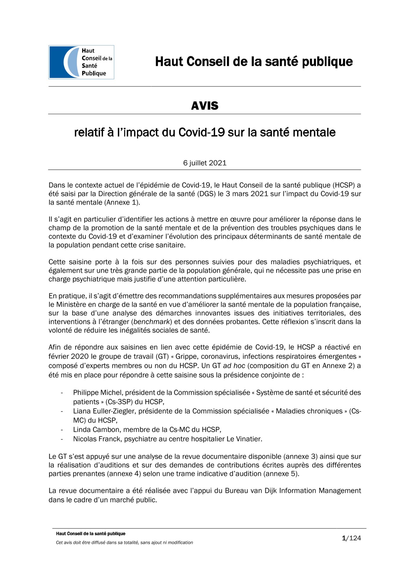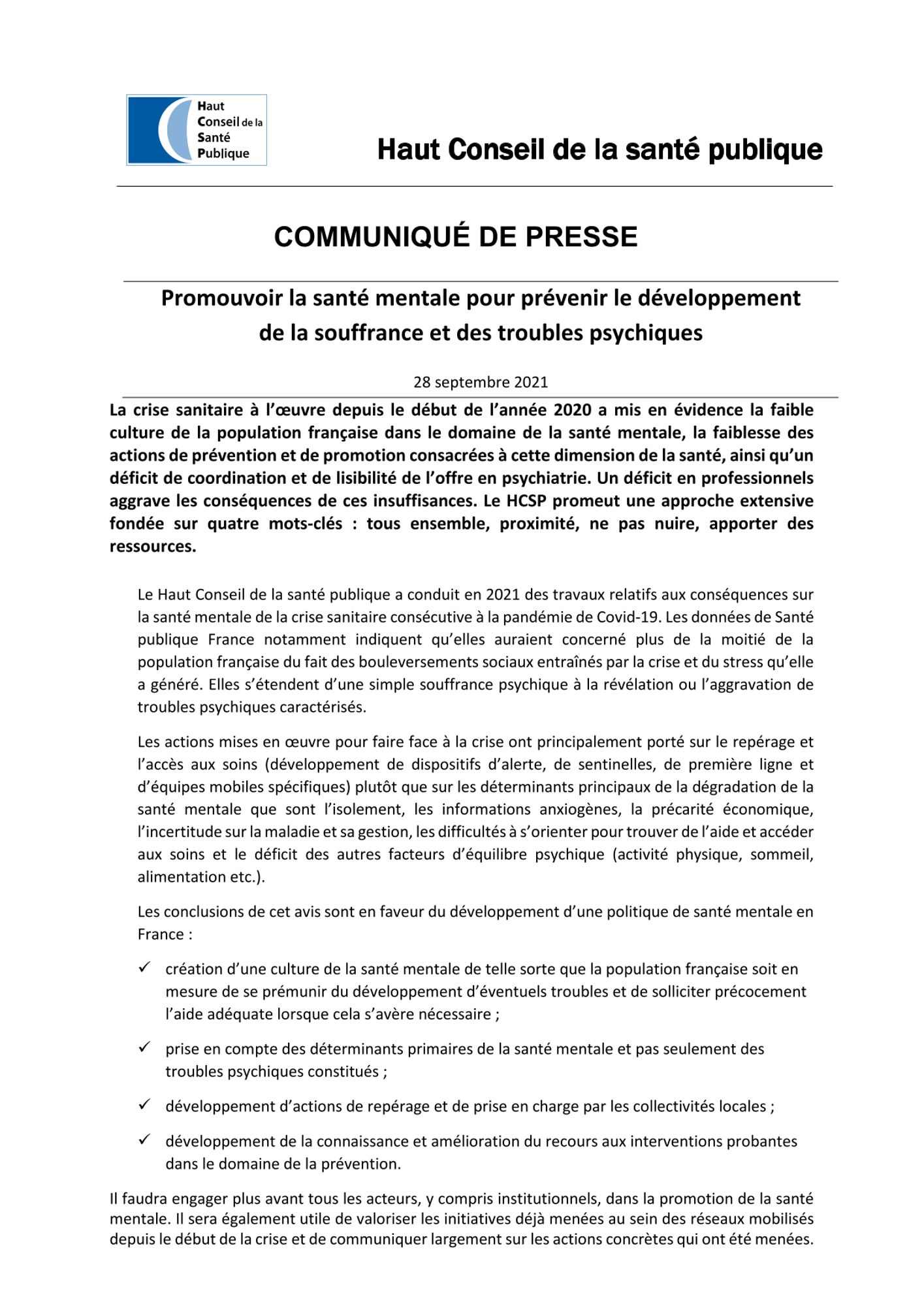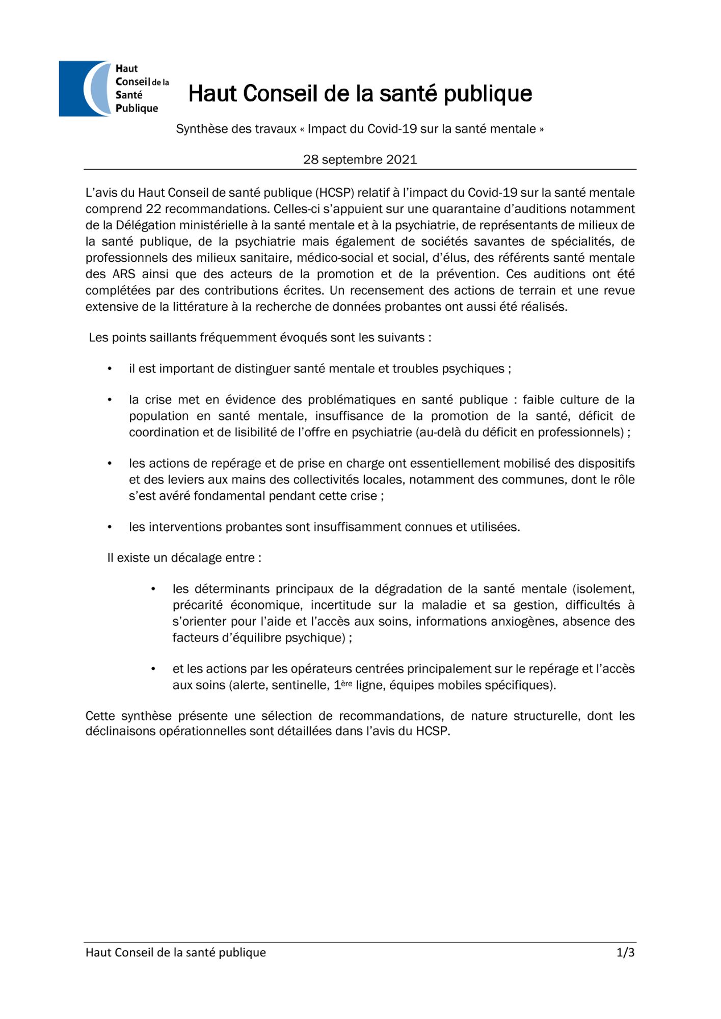 Étant donné l’impact notable de la crise sanitaire du Covid-19 sur la santé mentale et l’aggravation des vulnérabilités, les recommandations du HCSP pour limiter l’impact de cette crise sont d’une part spécifiques par populations (période péri-natale, enfants, étudiants, personnes âgées, professionnels de santé, milieu du travail, personnes vivant avec un trouble psychique…) et d’autre part générales.