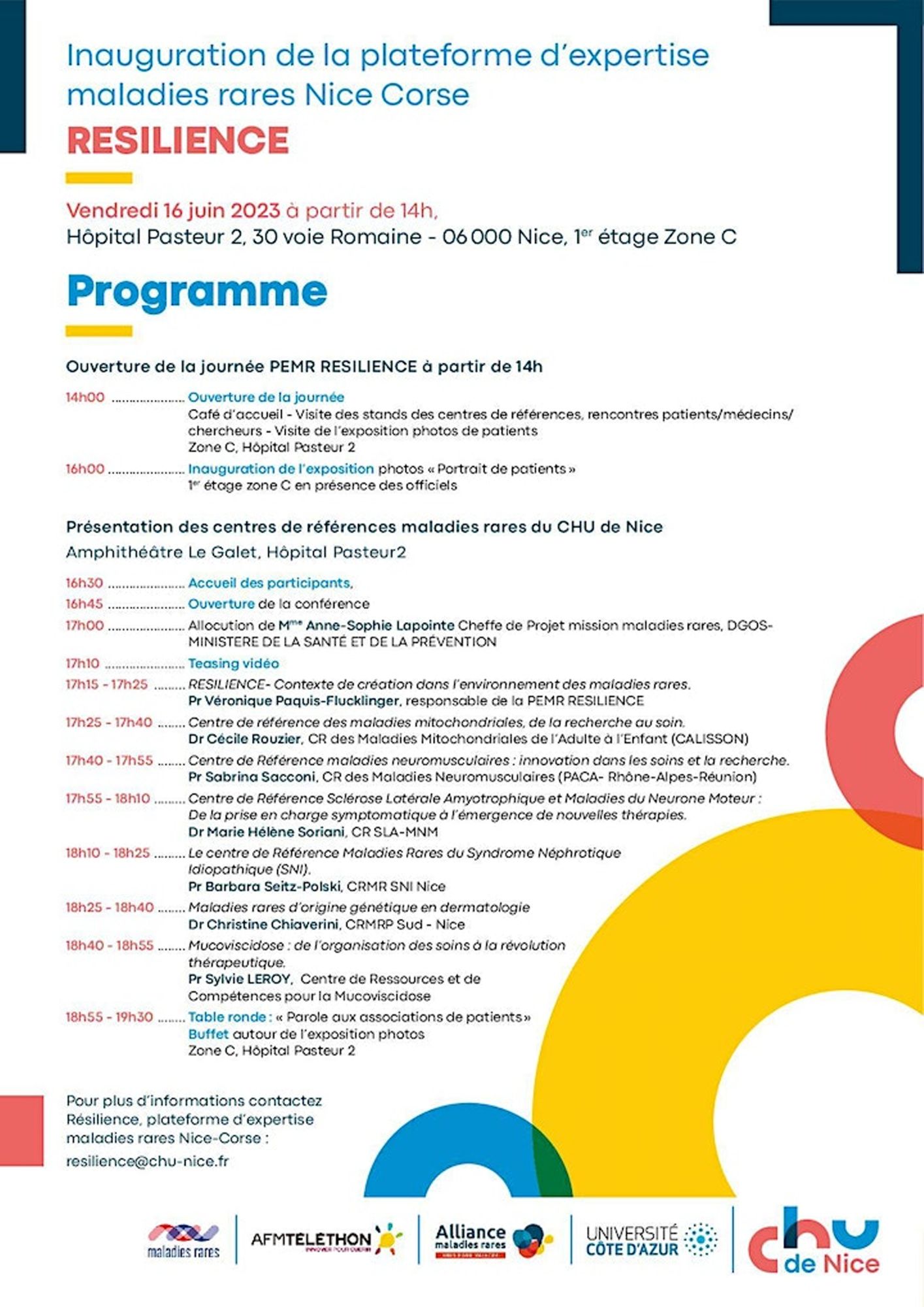 Inauguration PEMR RESILIENCE. Rencontres avec les professionnels de RESILIENCE, CRMR CHU de Nice et les associations de patients, le vendredi 16 juin 2023 à l'hôpital Pasteur 2 - Nice de 14h à 16h.