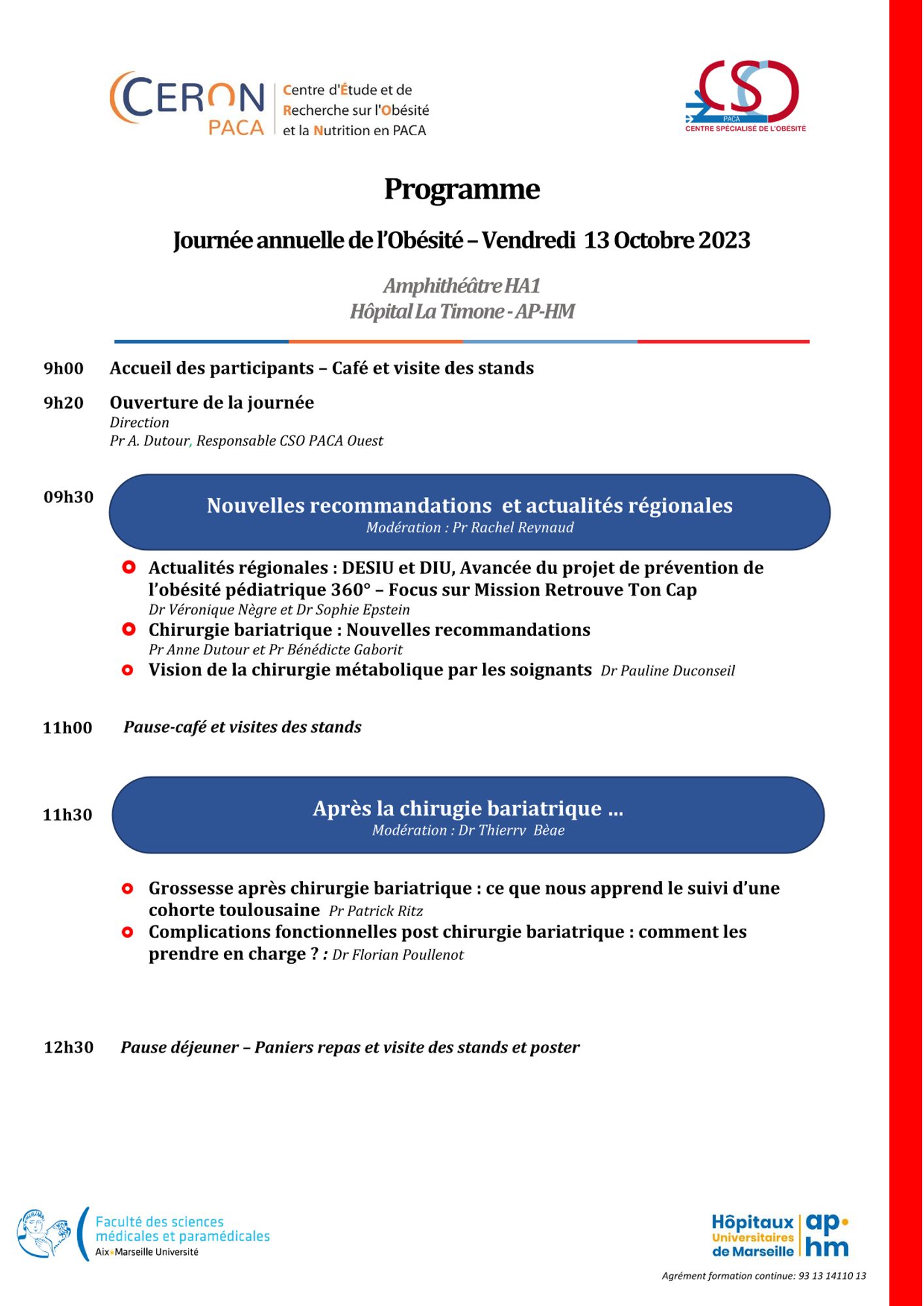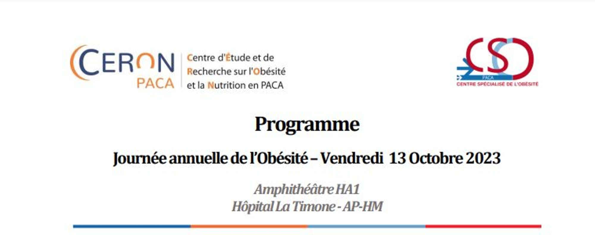 L'association CERON-PACA s'associe aux Centres Spécialisés de l'Obésité de PACA pour vous convier à la Journée régionale annuelle de l'Obésité de l'enfant et de l'adulte qui aura lieu : Vendredi 13 Octobre 2023 à l'hôpital de La Timone à Marseille.