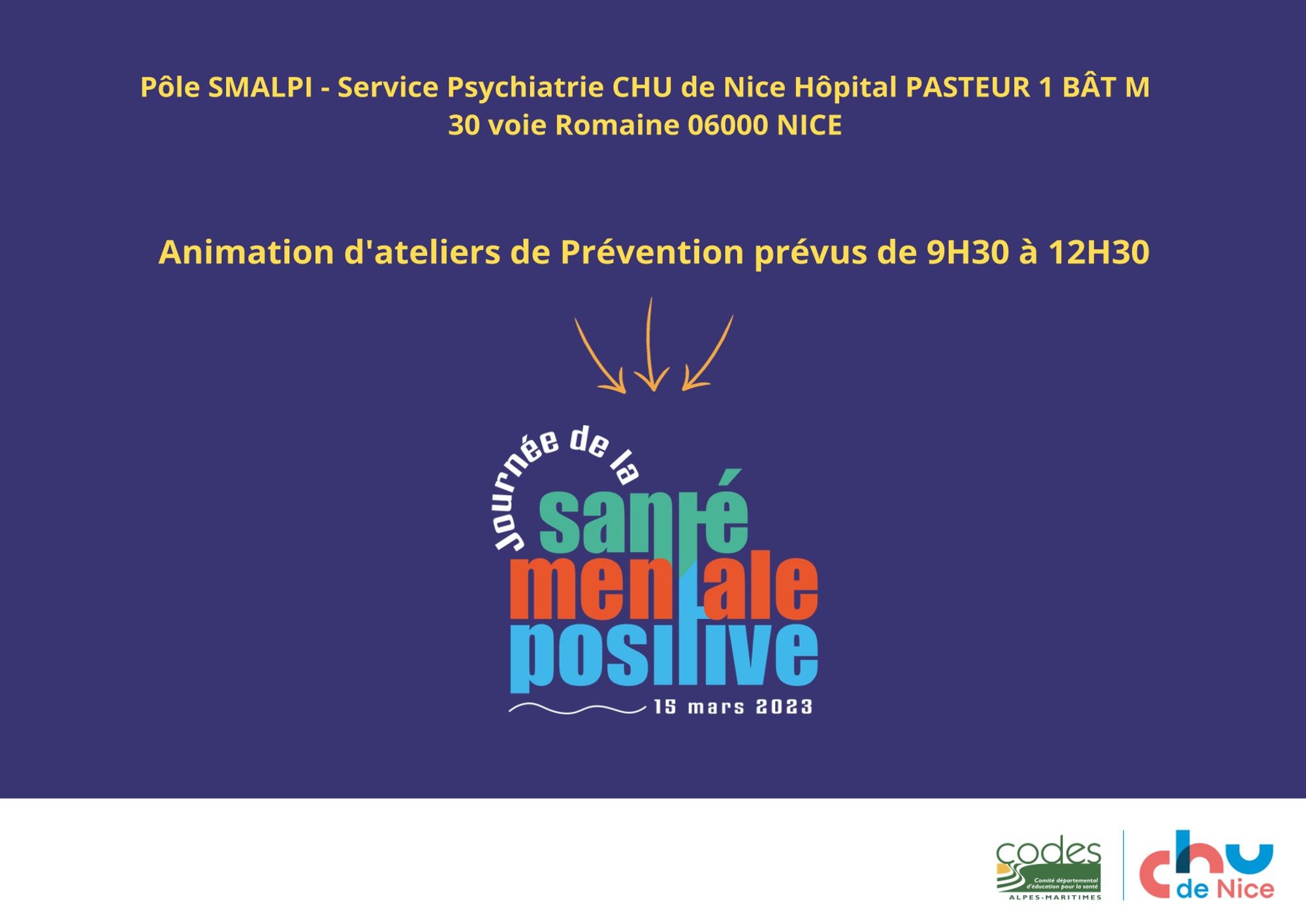 Journée de la santé mentale positive organisée par le CHU de Nice le 15 mars 2023, au Pôle SMALPI, service Psychiatrie CHU de Nice Hôpital Pasteur 1 Bât M - 30 voie Romaine - 06000 Nice.