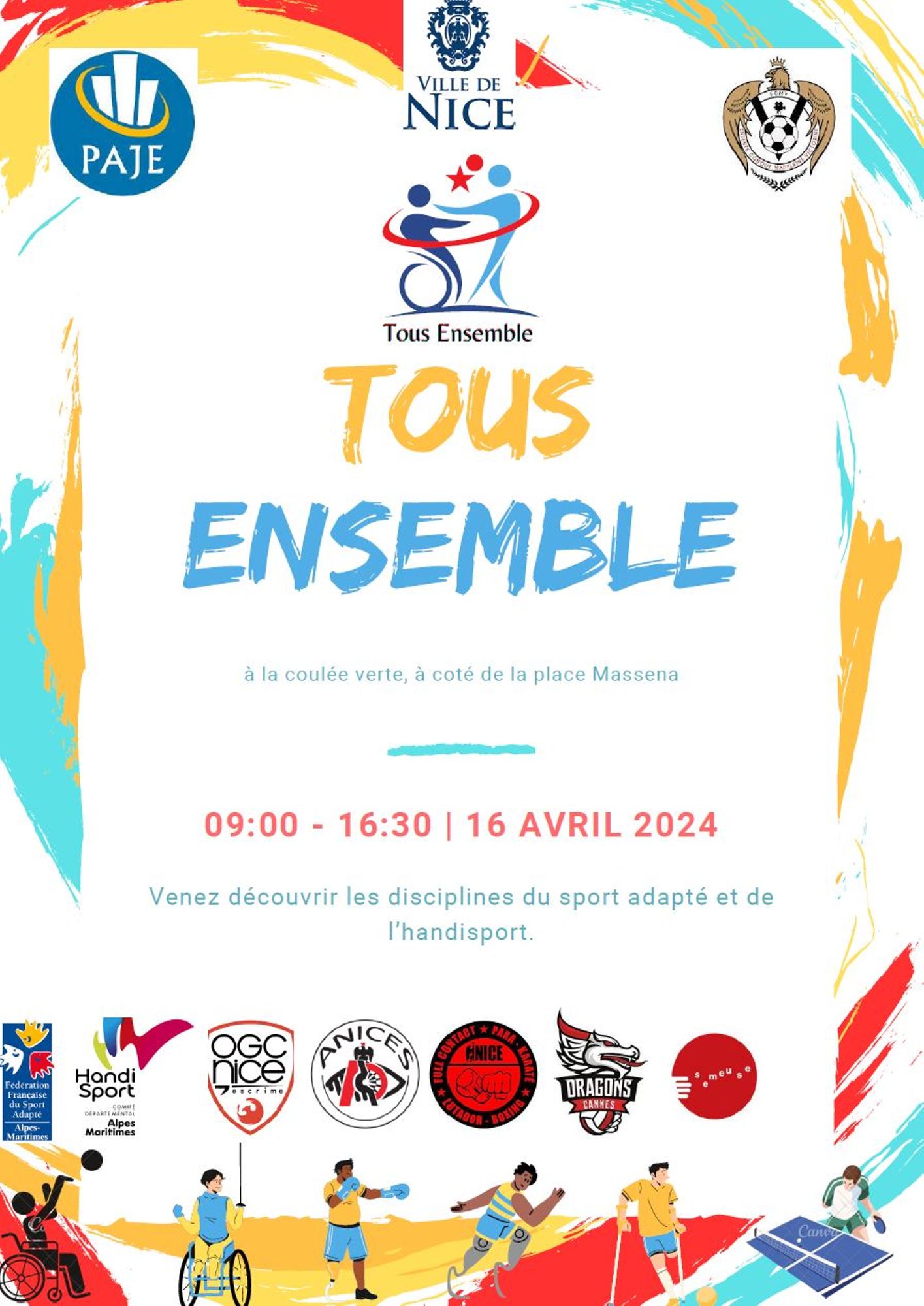 L'association PAJE et la Ville de Nice organise une journée de sensibilisation sur le sport adapté et Handisport le 16 avril 2024 sur la coulée verte, à côté de la place Masséna.