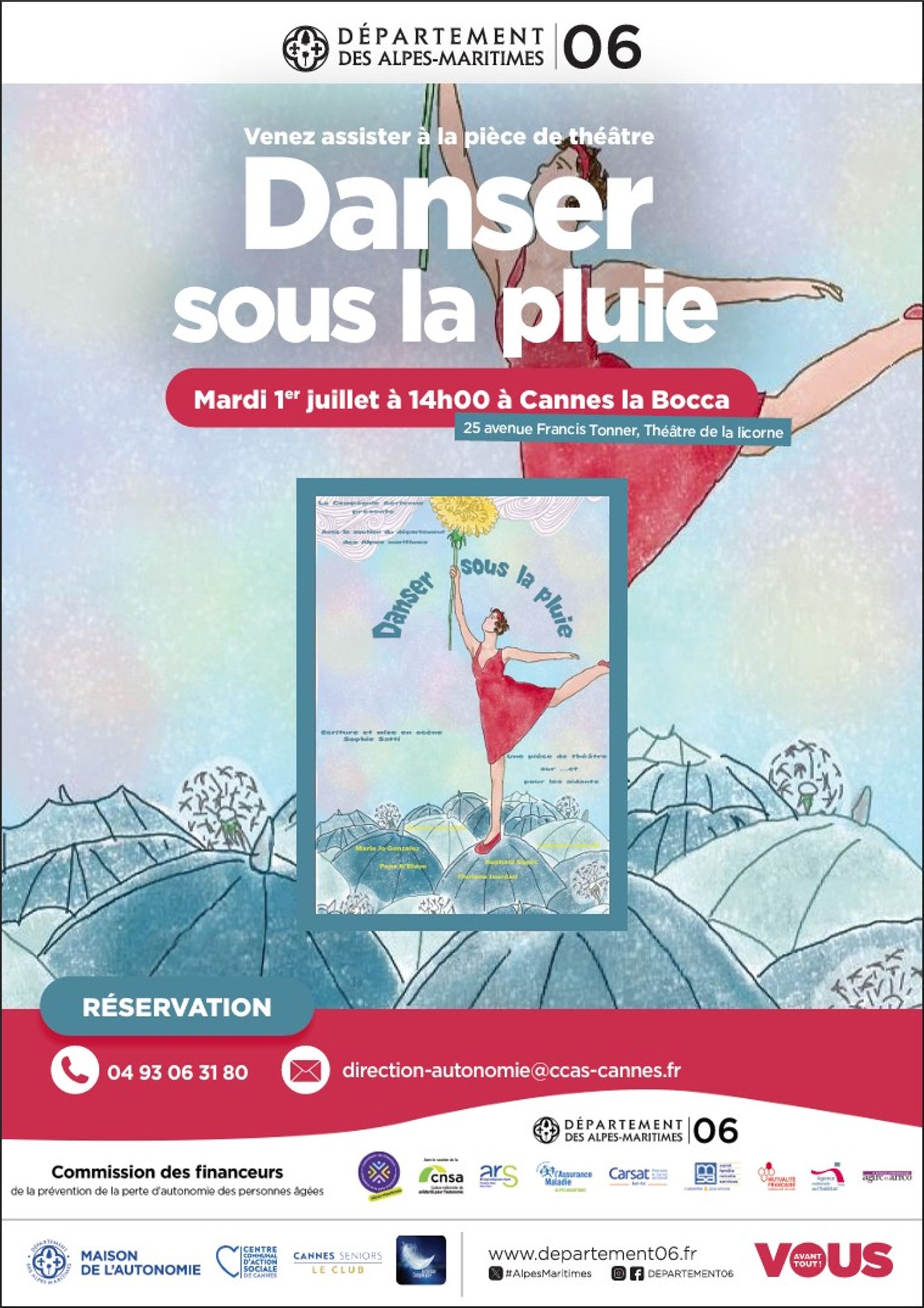 Avec l’ouverture de la Maison de l’Autonomie de Cannes et dans le cadre du Plan Départemental d’Aide aux Aidants Seniors & Handicap, le Département et le Centre Communal d’Action Sociale de Cannes (CCAS) proposent, en partenariat avec Cannes Seniors Le Club et la Ville de Cannes, une pièce de théâtre « Danser sous la pluie » à destination des aidants de personnes âgées et de personnes en situation de handicap.