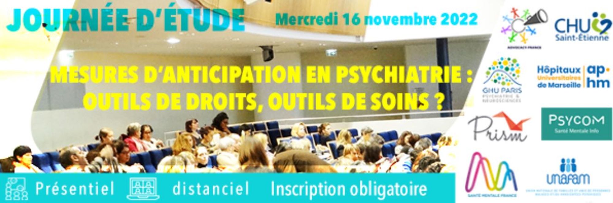 Cette journée vous est proposée par ADVOCACY-FRANCE, AP-HM, CHU Saint-Etienne, GHU Paris psychiatrie et neurosciences, PRISM, PSYCOM, SANTE MENTALE France, UNAFAM.