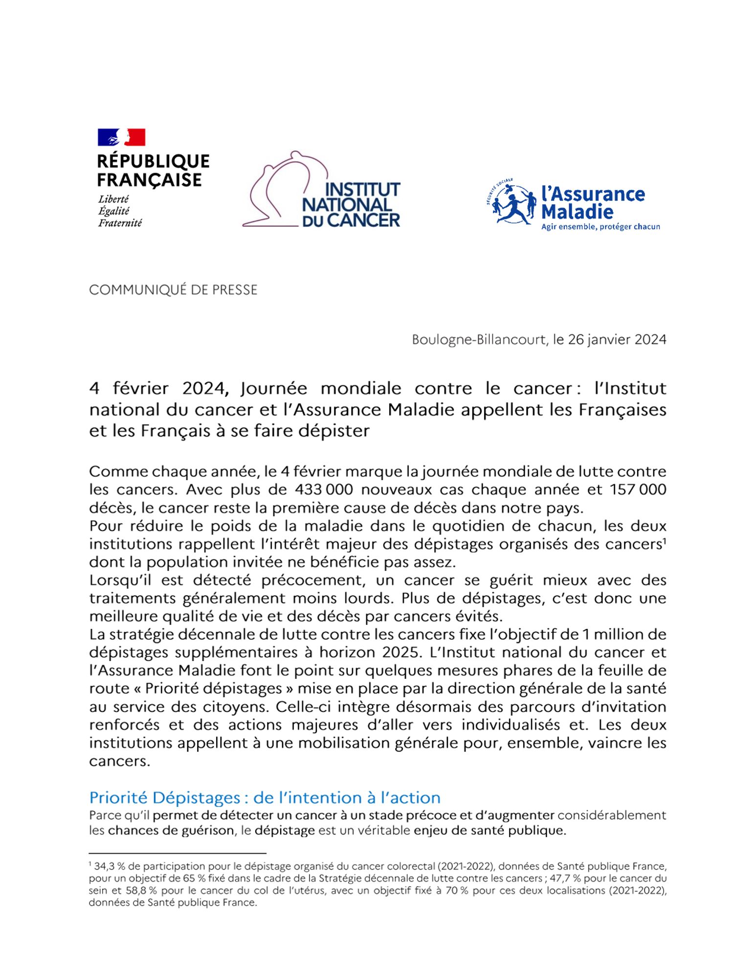 Comme chaque année, le 4 février marque la journée mondiale de lutte contre les cancers. Avec plus de 433 000 nouveaux cas chaque année et 157 000 décès, le cancer reste la première cause de décès dans notre pays. Pour réduire le poids de la maladie dans le quotidien de chacun, les deux institutions rappellent l’intérêt majeur des dépistages organisés des cancers dont la population invitée ne bénéficie pas assez.