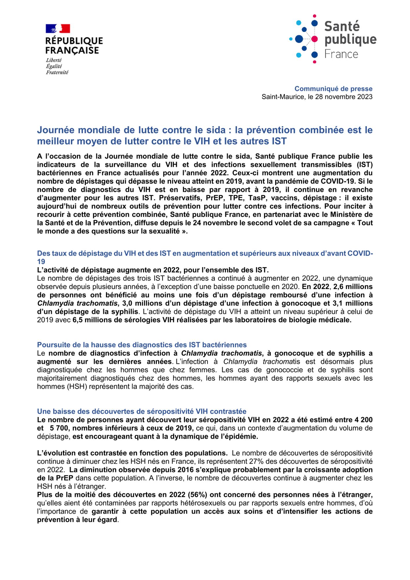 Ceux-ci montrent une augmentation du nombre de dépistages qui dépasse le niveau atteint en 2019, avant la pandémie de COVID-19. Si le nombre de diagnostics du VIH est en baisse par rapport à 2019, il continue en revanche d’augmenter pour les autres IST. Préservatifs, PrEP, TPE, TasP, vaccins, dépistage : il existe aujourd’hui de nombreux outils de prévention pour lutter contre ces infections. Pour inciter à recourir à cette prévention combinée, Santé publique France, en partenariat avec le Ministère de la Santé et de la Prévention, diffuse depuis le 24 novembre le second volet de sa campagne « Tout le monde a des questions sur la sexualité ».