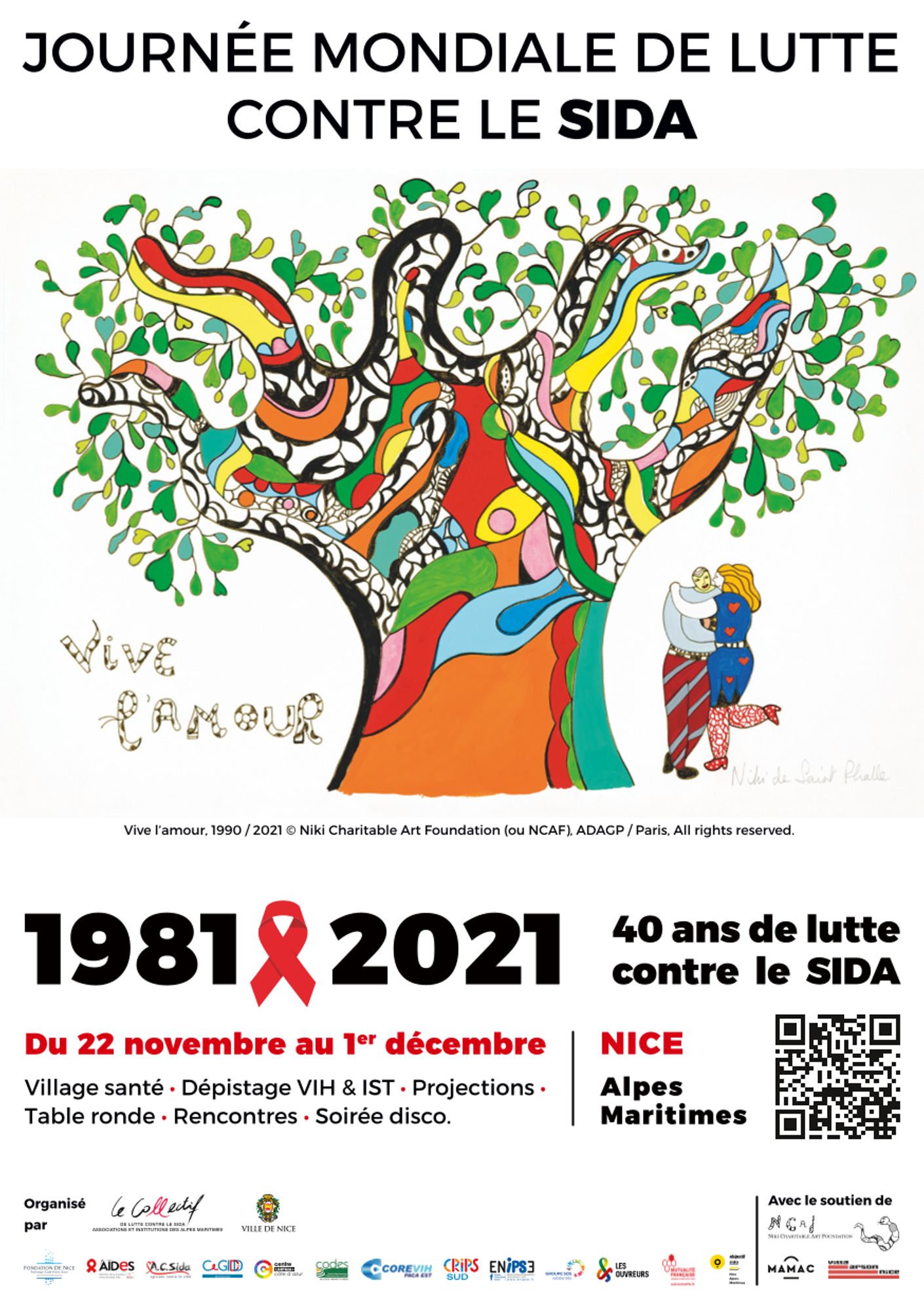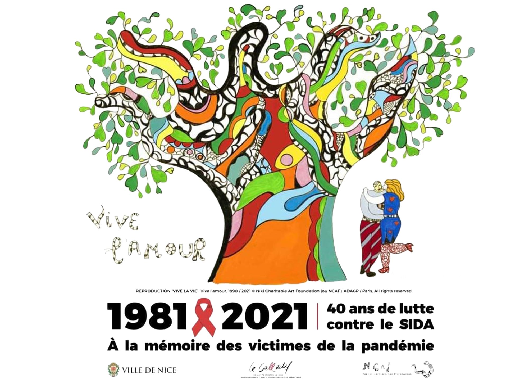 Point d’orgue de ces événements, le 1er décembre aura lieu le dévoilement d’une plaque à la mémoire des victimes de la pandémie par Monsieur le maire de Nice, Christian Estrosi. Cette cérémonie se déroulera au Jardin Sacha Sosno en de personnes vivant avec le VIH et de Bloum Cardenas, petite fille de Niki de Saint Phalle, et présidente de la Niki Charitable Art Foundation, qui a accepté que l’œuvre, Vive l’amour, réalisée par l’artiste en hommage aux victimes du Sida, orne cette plaque commémorative et l’affiche du 1er décembre proposée par le Collectif 06 de lutte contre le Sida.