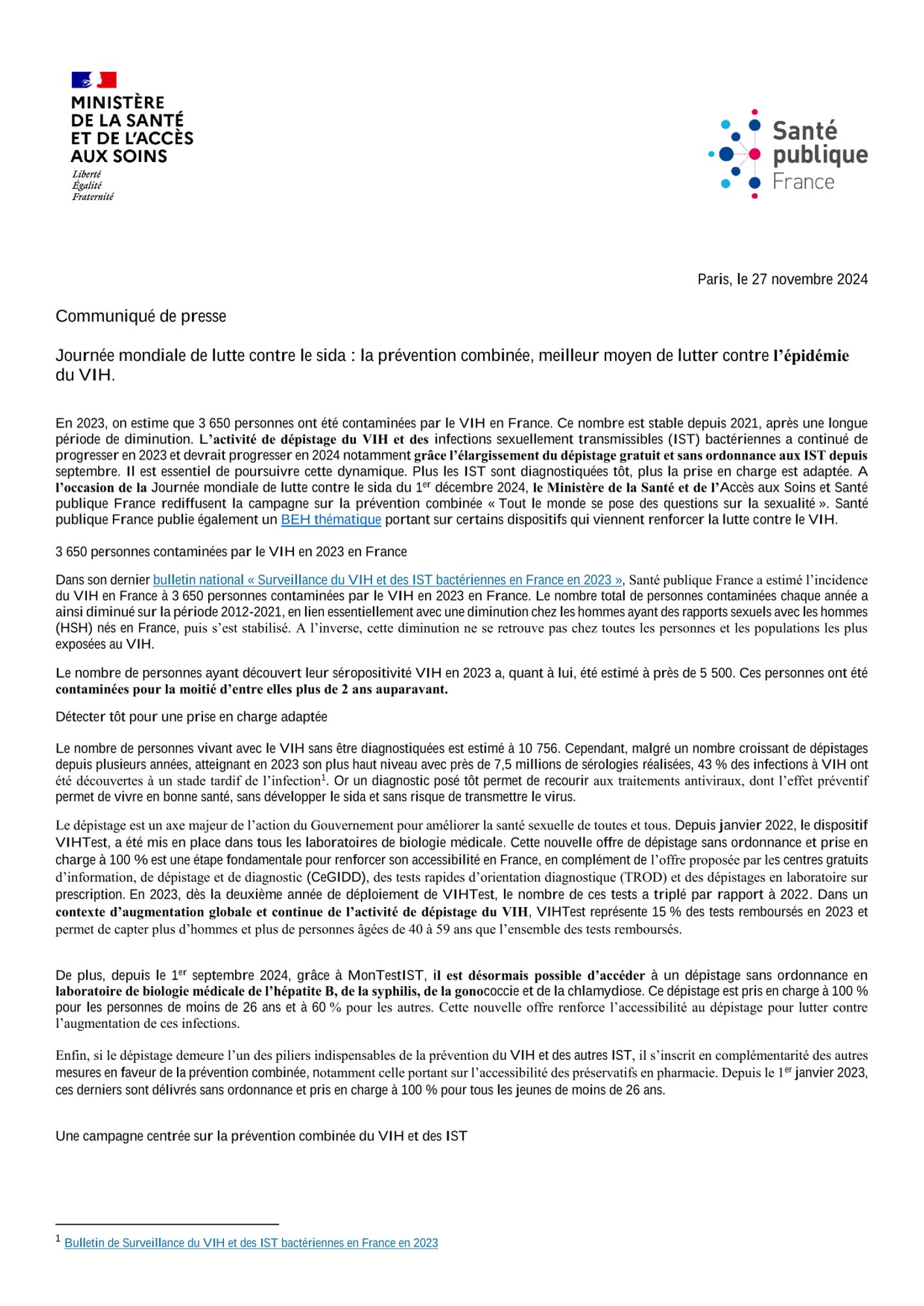 En 2023, on estime que 3 650 personnes ont été contaminées par le VIH en France. Ce nombre est stable depuis 2021, après une longue période de diminution. L’activité de dépistage du VIH et des infections sexuellement transmissibles (IST) bactériennes a continué de progresser en 2023 et devrait progresser en 2024 notamment grâce l’élargissement du dépistage gratuit et sans ordonnance aux IST depuis septembre. Il est essentiel de poursuivre cette dynamique. Plus les IST sont diagnostiquées tôt, plus la prise en charge est adaptée.