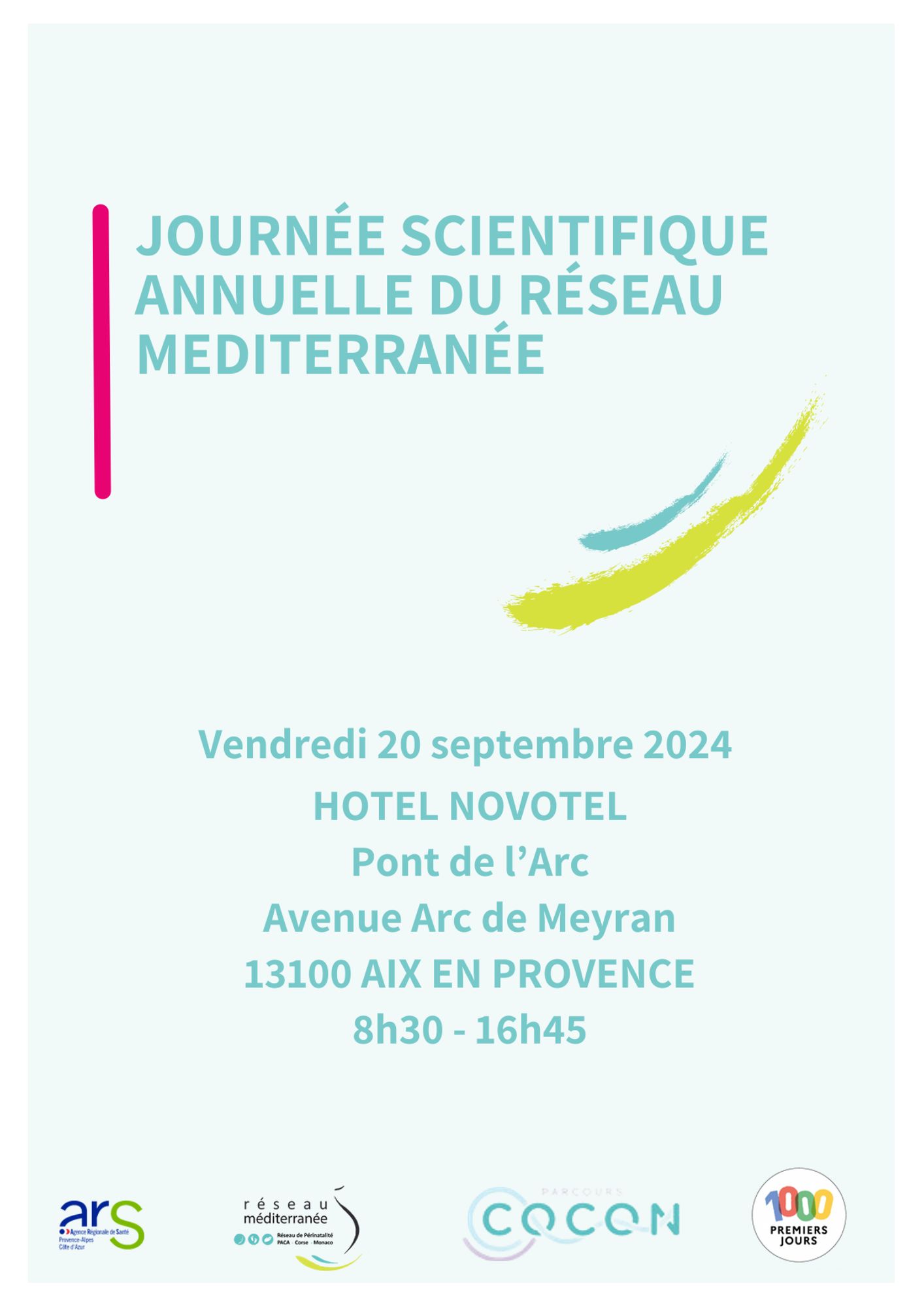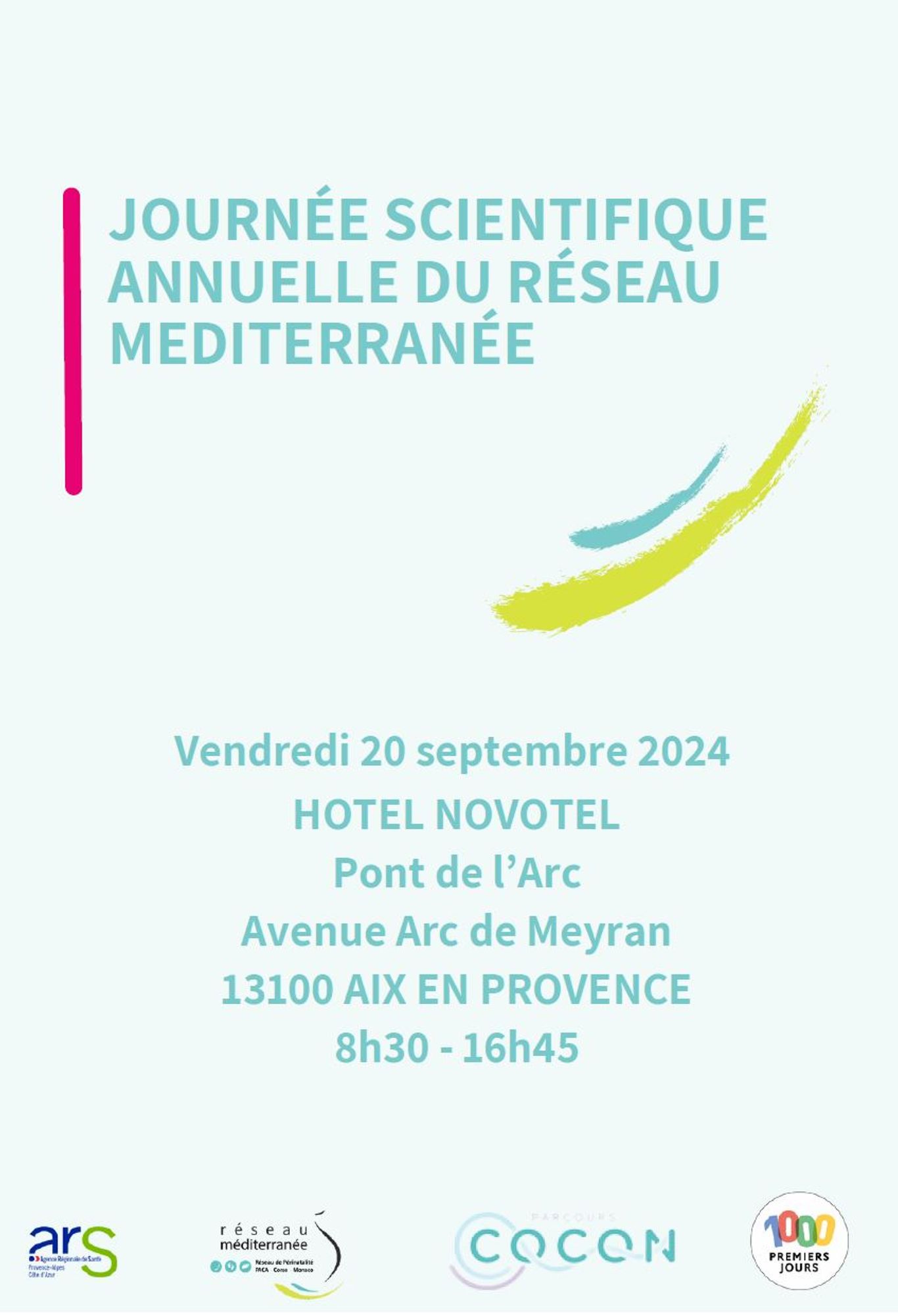 La Journée Scientifique du Réseau Méditerranée aura lieu le Vendredi 20 septembre 2024 de 9h00 à 17h00, HOTEL NOVOTEL Aix en Provence Pont de L’Arc - Avenue Arc de Meyran 13100 Aix en Provence.