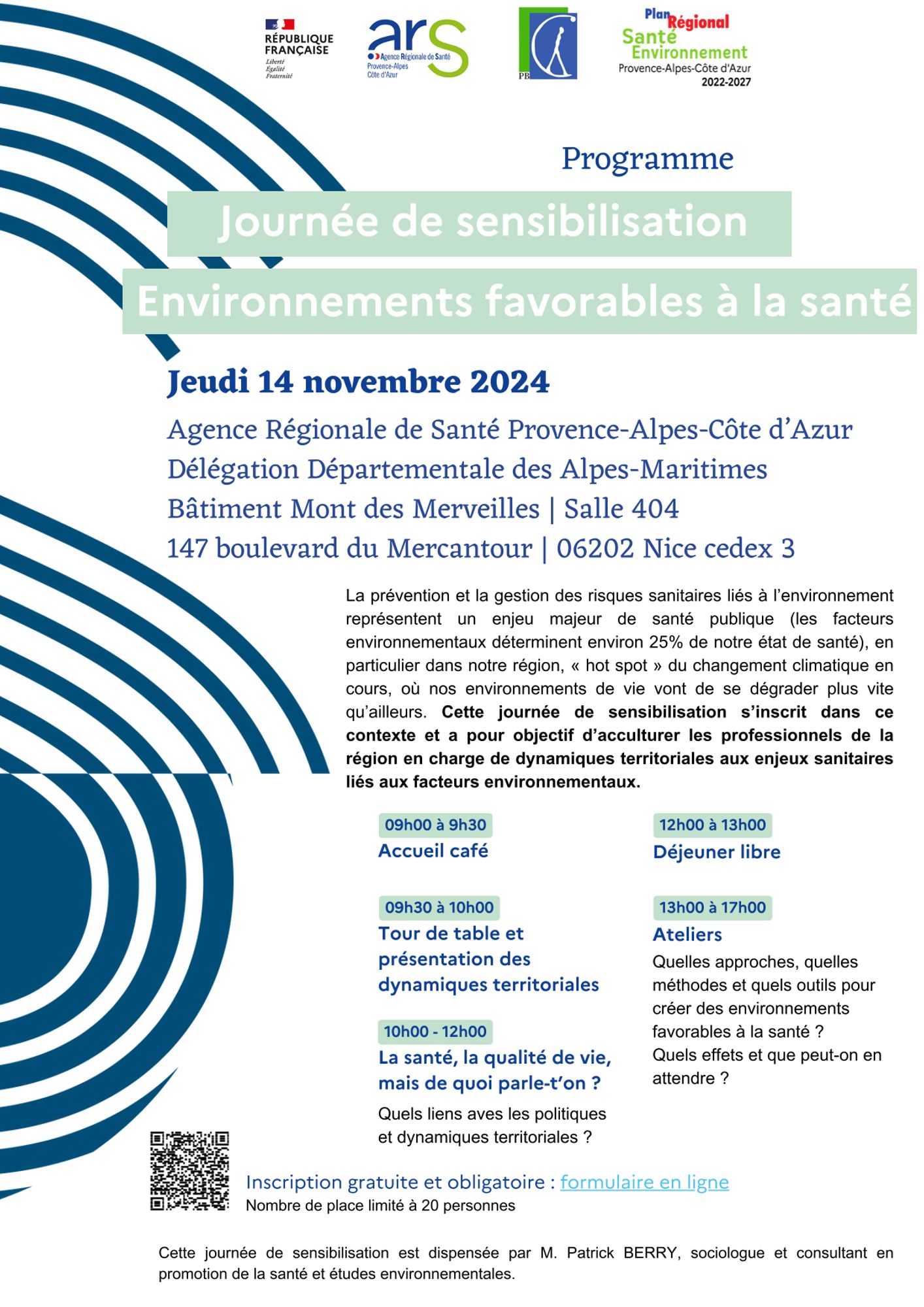 Dans le cadre du PRSE 4, l'ARS Paca organise des journées départementales "Environnements favorables à la santé" pour sensibiliser les professionnels de la région en charge de dynamiques territoriales de santé et/ou environnement aux enjeux sanitaires liés aux facteurs environnementaux. La prochaine journée aura lieu à Nice le 14 Novembre de 9h à 17h - à la DD06 Salle 404 147 Boulevard du Mercantour 06202 Nice cedex 3.
