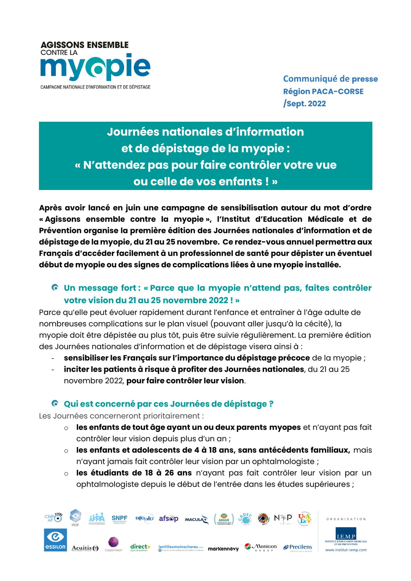 Après avoir lancé en juin une campagne de sensibilisation autour du mot d’ordre « Agissons ensemble contre la myopie », l’Institut d’Education Médicale et de Prévention organise la première édition des Journées nationales d’information et de dépistage de la myopie, du 21 au 25 novembre. Ce rendez-vous annuel permettra aux Français d’accéder facilement à un professionnel de santé pour dépister un éventuel début de myopie ou des signes de complications liées à une myopie installée.