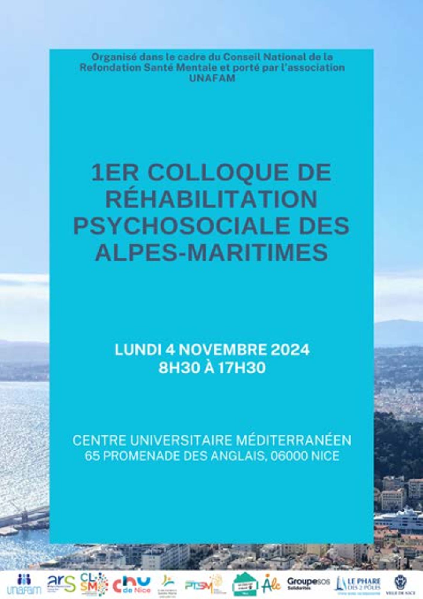 L’organisation de ce colloque s’inscrit dans le cadre du Conseil National de la Refondation Santé Mentale et sera portée par l’association UNAFAM avec le soutien de l’ARS et en partenariat avec le Projet Territorial de Santé Mentale des Alpes-Maritimes, le Centre de Réhabilitation Psychosociale de Proximité du CHU de Nice, le Centre Hospitalier Sainte Marie de Nice, le GCSMS porteur du dispositif « ACT - Un Chez Soi d’Abord », l’association ALC, le Groupe SOS Solidarités ainsi que le Conseil Local en Santé Mentale de la ville de Nice.
