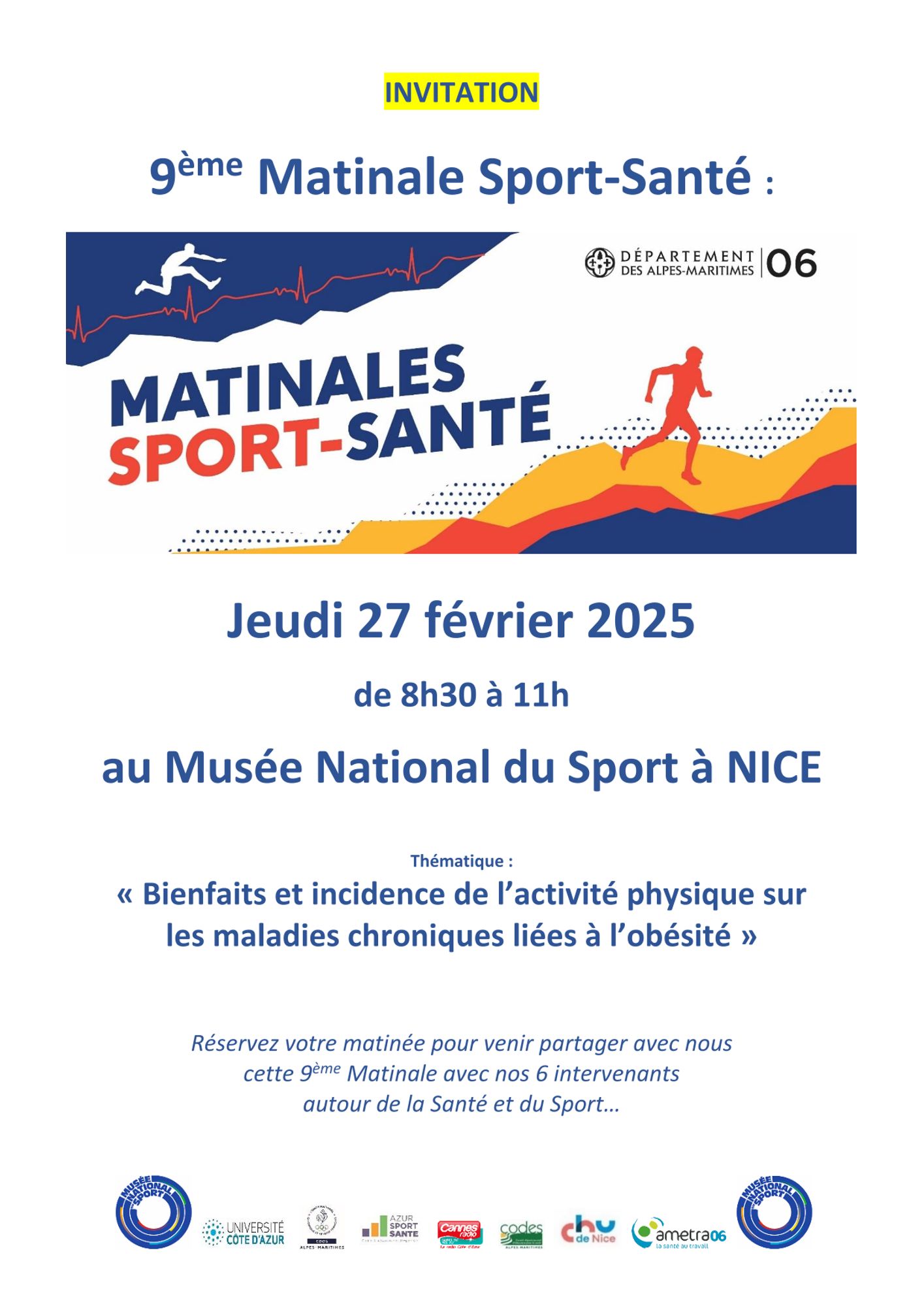 La 9ème matinale sport-santé aura lieu le jeudi 27 février 2025 de 8h30 à 10h45, la thématique abordée sera : « Bienfaits et incidence de l’activité physique sur les maladies chroniques liées à l’obésité », avec encore une fois six intervenants de qualité à parité pour la partie santé et pour la partie sport.