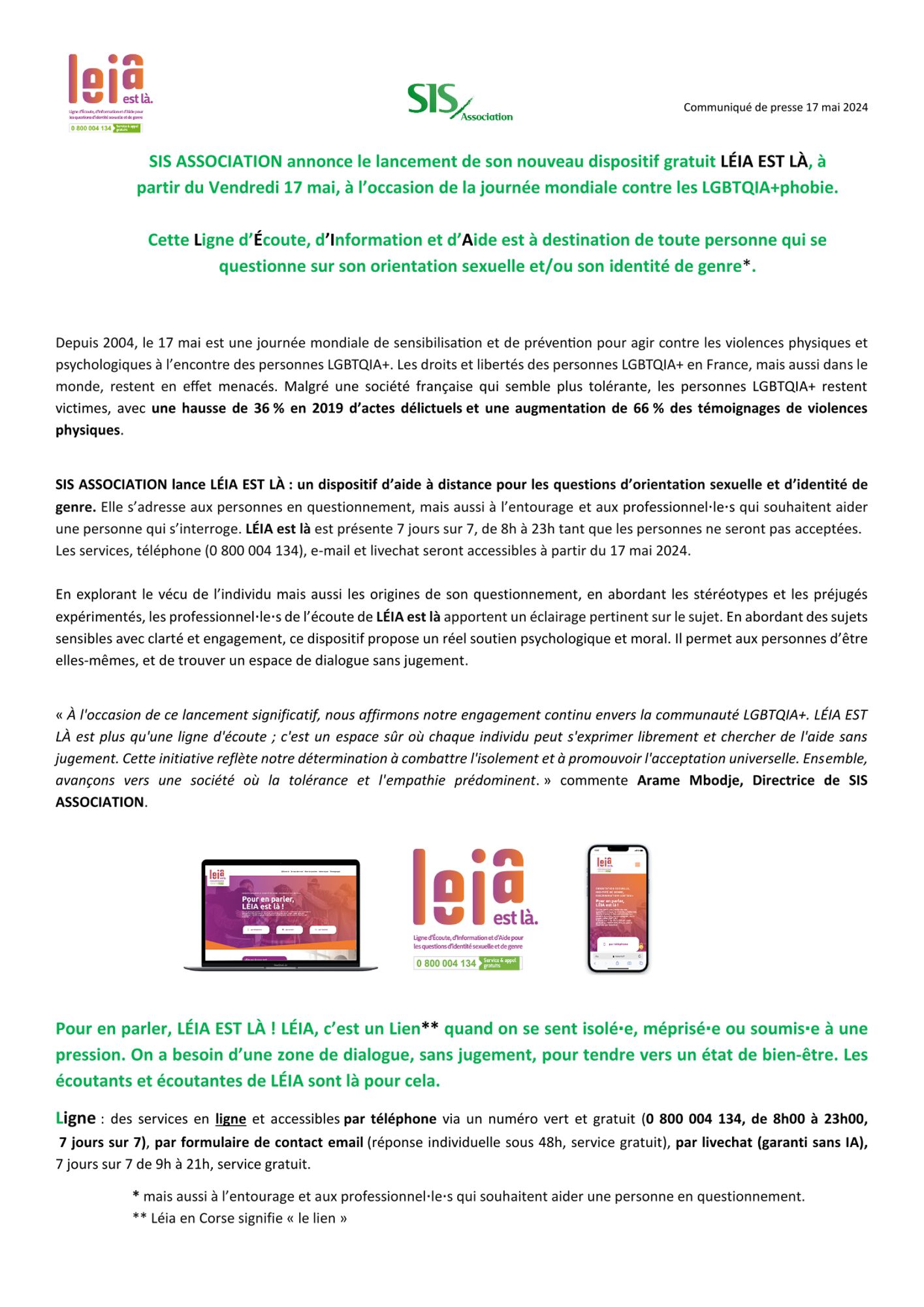 SIS ASSOCIATION annonce le lancement de son nouveau dispositif gratuit LÉIA EST LÀ, à partir du Vendredi 17 mai, à l’occasion de la journée mondiale contre les LGBTQIA+phobie.