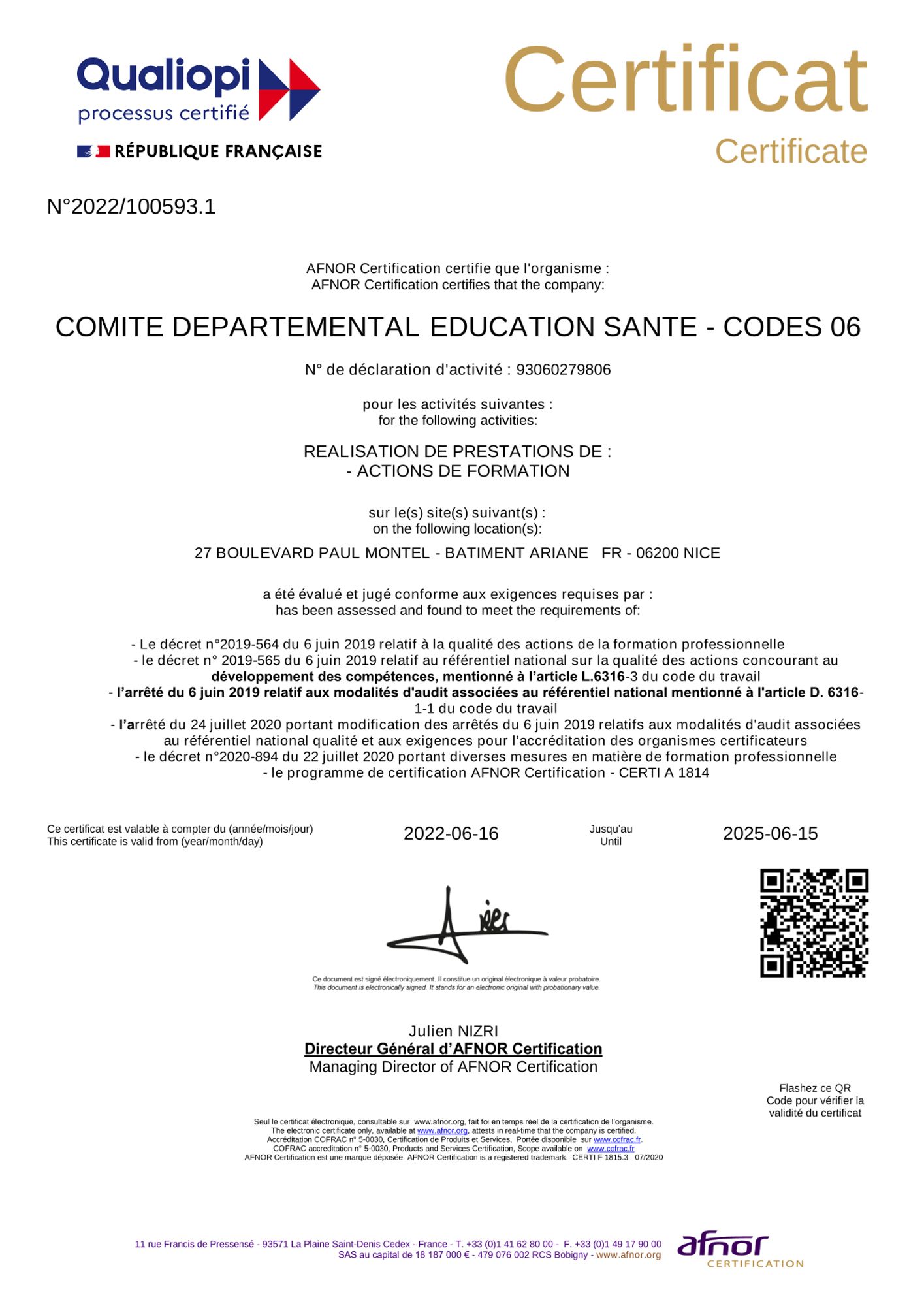 N° de certificat Référentiel National Qualité / Qualiopi : 100593