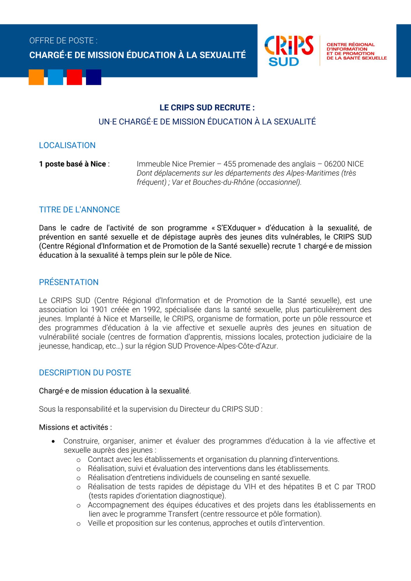 Dans le cadre de l'activité de son programme « S’EXduquer » d’éducation à la sexualité, de prévention en santé sexuelle et de dépistage auprès des jeunes dits vulnérables, le CRIPS SUD (Centre Régional d'Information et de Promotion de la Santé sexuelle) recrute 1 chargé·e de mission éducation à la sexualité à temps plein (CDD de 6 mois (renouvelable)) sur le pôle de Nice. (voir offre d'emploi ci-jointe).