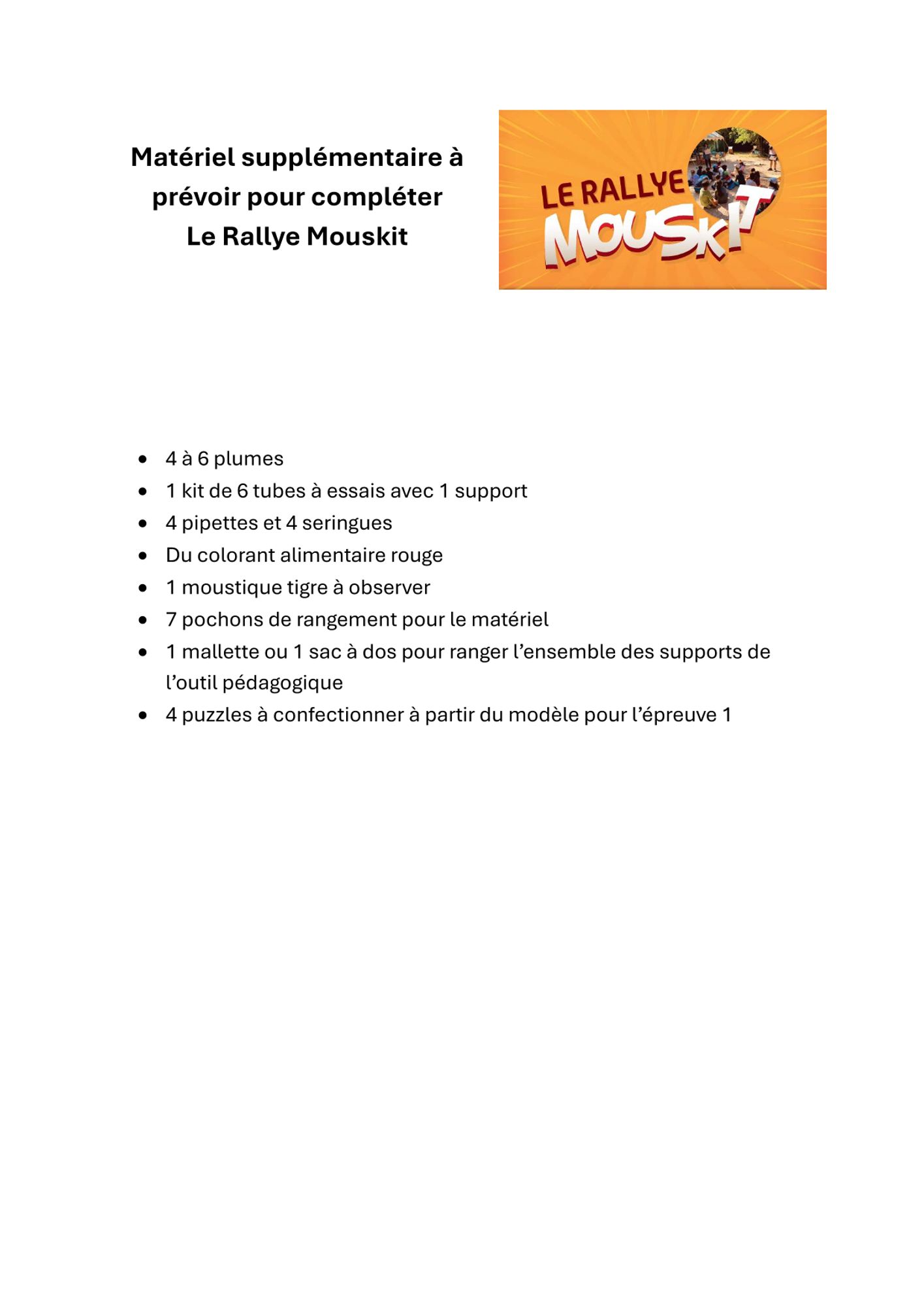 Le Rallye Mouskit est un nouvel outil pédagogique de sensibilisation des enfants à la lutte contre le moustique tigre, dans le cadre d'activités ludiques en centres de loisirs. Il a pour objectif d’améliorer les connaissances des 8-12 ans sur les moustiques et de promouvoir de nouveaux comportements individuels et collectifs.