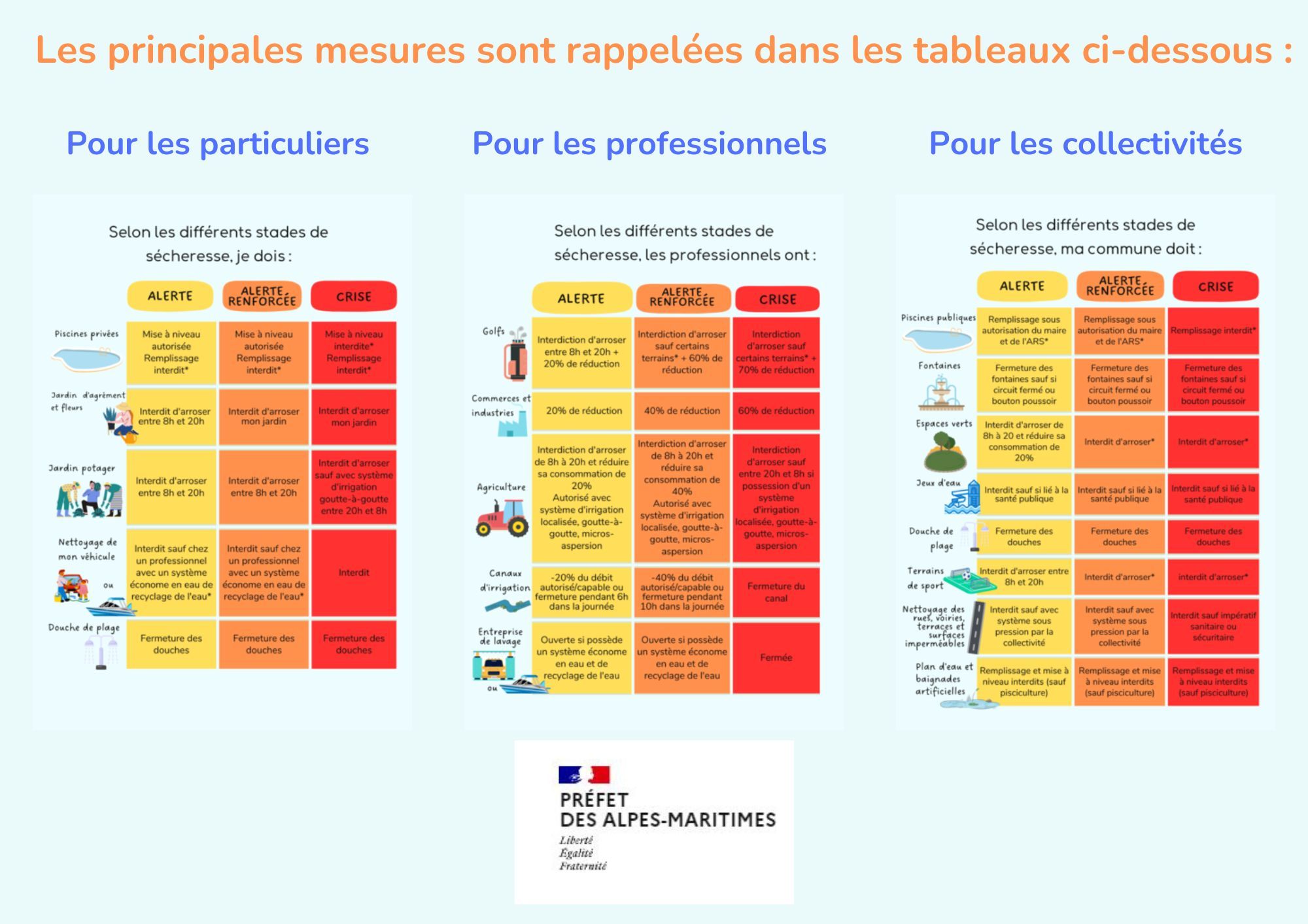 Ces mesures de restriction d’eau, rappelées dans l’arrêté disponible sur www.alpes-maritimes.gouv.fr , s’appliquent à l’ensemble des usages, à l’exception des usages prioritaires liés à la santé, la salubrité et la sécurité civile.