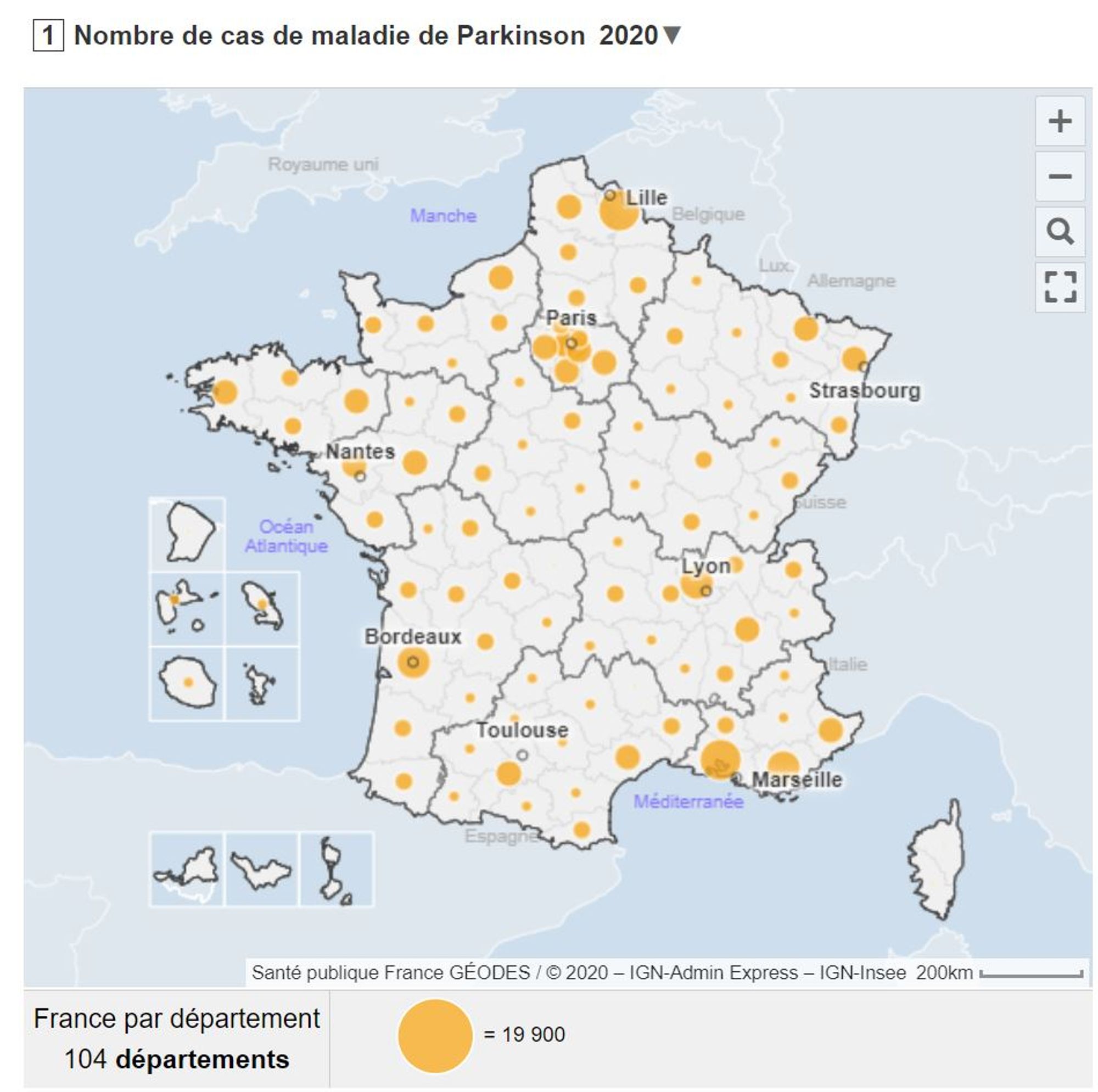 En 2020, les données mettent en évidence une certaine hétérogénéité en terme d’incidence notamment dans les départements de Guyane, de l’Indre, des Bouches-du-Rhône, de la Vienne, et de la Lozère qui présentent des fréquences plus élevées que le reste du territoire. Compte-tenu de l’étiologie multifactorielle de la maladie de Parkinson, ces disparités géographiques n’ont pas d’explication évidente. Des études spécifiques permettraient de mieux caractériser les facteurs de risque ou protecteurs de la maladie.