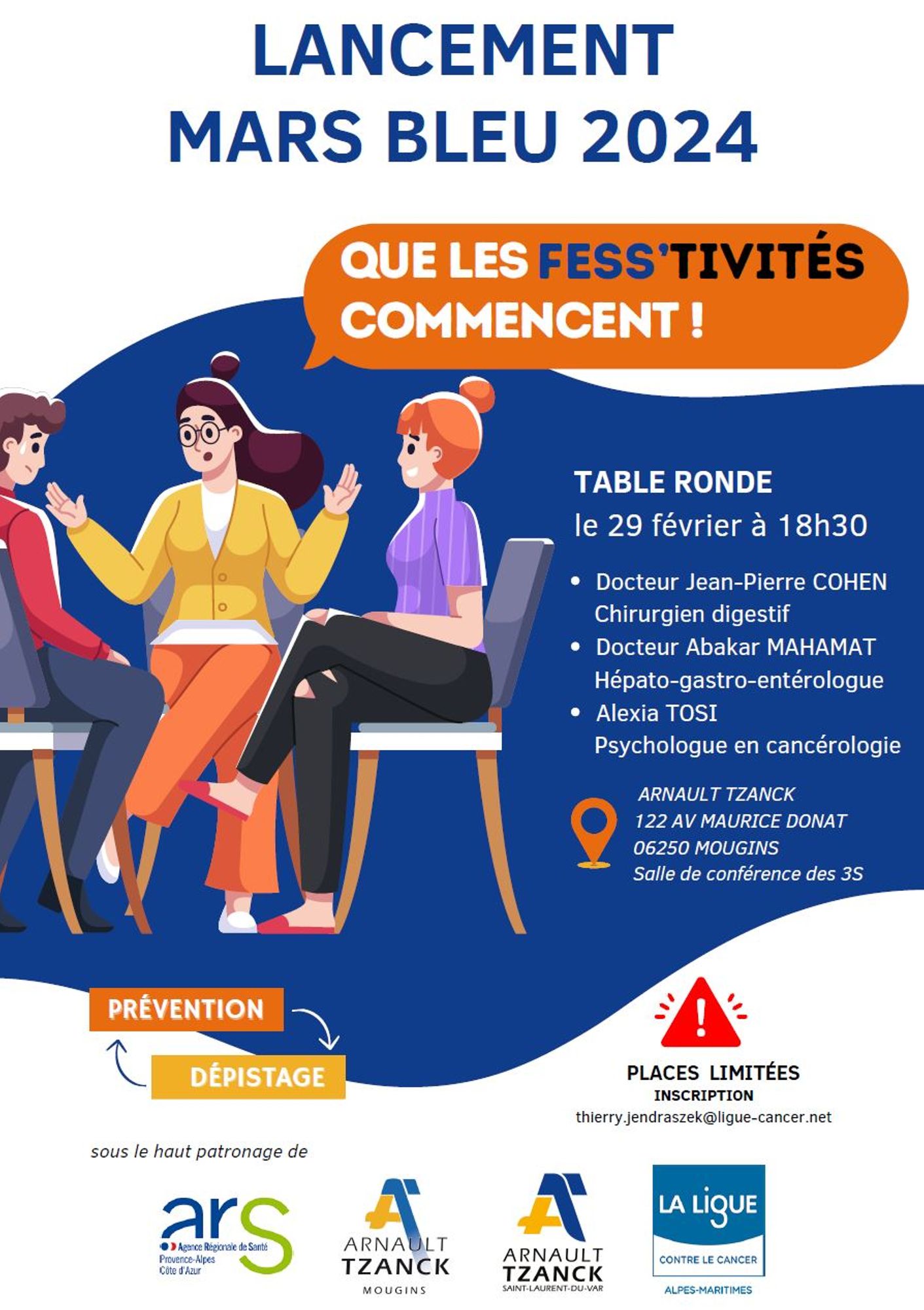 A l’occasion de Mars Bleu sur la sensibilisation du dépistage du cancer colorectal La ligue contre le cancer des Alpes-Maritimes, organise sous le haut patronage de l’ARS et des instituts Arnault TZANCK une table ronde le 29 février à 18 h 30 à la salle de conférence des 3S de l’institut Arnault TZANCK de Mougins.