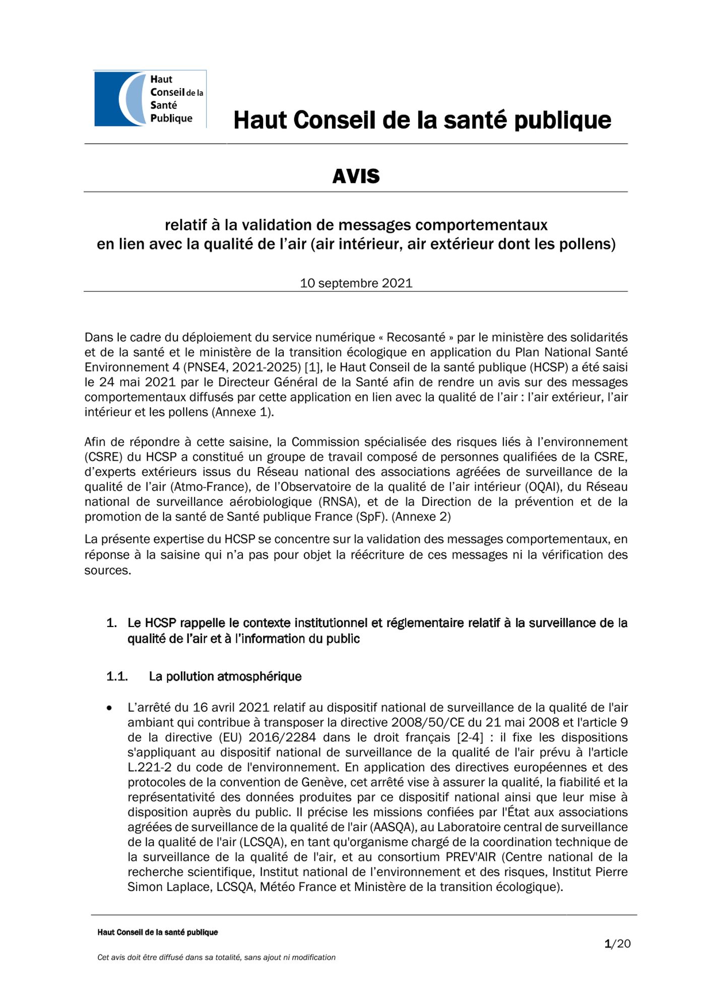 Dans le cadre du déploiement du service numérique « Recosanté » par le ministère des solidarités et de la santé et le ministère de la transition écologique en application du Plan National Santé Environnement 4 (PNSE4, 2021-2025) [1], le Haut Conseil de la santé publique (HCSP) a été saisi le 24 mai 2021 par le Directeur Général de la Santé afin de rendre un avis sur des messages comportementaux diffusés par cette application en lien avec la qualité de l’air : l’air extérieur, l’air intérieur et les pollens (Annexe 1).