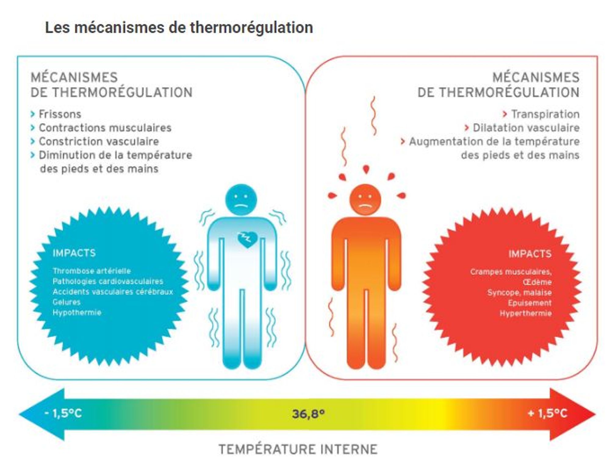 Lorsqu’il fait très chaud, la température du corps aura tendance à s’élever. Pour réguler la température et se maintenir à 37°C, le corps va devoir mettre en place plusieurs mécanismes.