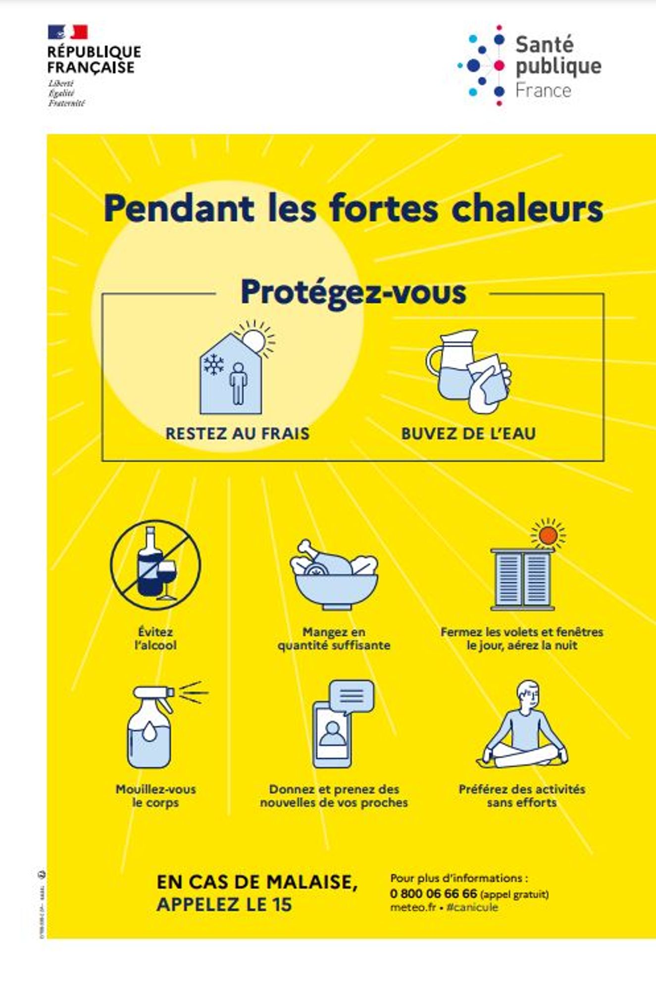 Une plateforme téléphonique d'information "Canicule", accessible au 0 800 06 66 66 (appel gratuit depuis un poste fixe en France), est activée l’été à partir du premier épisode de canicule, par la Direction générale de la santé (appel gratuit depuis un poste fixe en France, de 9h à 19h) pour répondre aux questions et informer sur les recommandations sanitaires à suivre en période de fortes chaleurs.