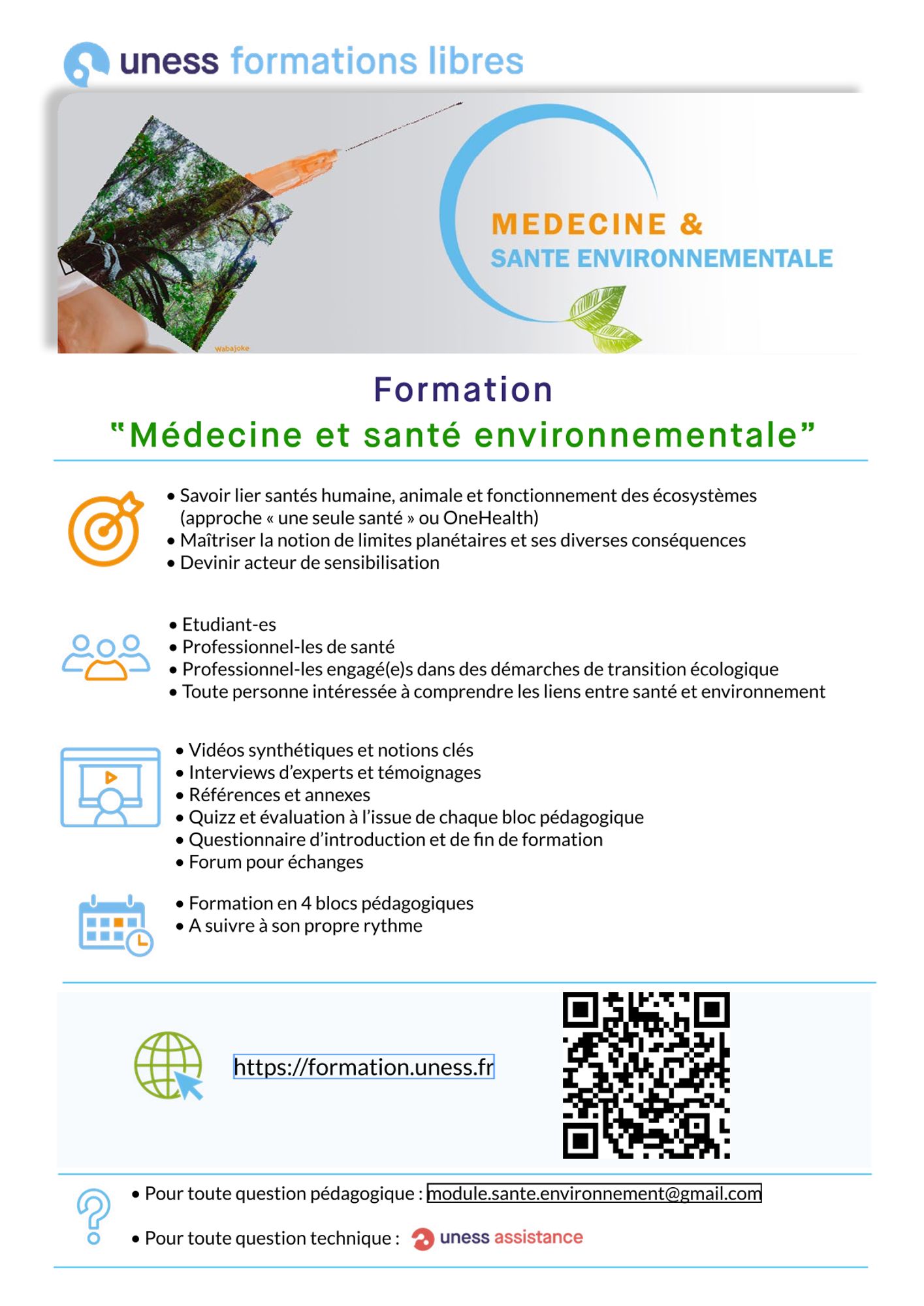 Depuis la rentrée universitaire 2023-24, le module « Médecine et santé environnementale » est intégré dans la formation initiale des étudiants en médecine du deuxième cycle (DFGSM 2 ou DFGSM 3). Sous l’égide de la Conférence des doyens de Médecine, ce module « Médecine et santé environnementale » est un projet d’enseignement national porté par le Dr Marine Sarfati. Il a rassemblé des professeurs et experts des domaines concernés (médecins, biologistes, écologues, urbaniste, hydrologue, paléontologue, ingénieurs, docteurs en sciences de gestion, en sciences politiques...). Leur participation s’est traduite par la réalisation d’une vingtaine de capsules vidéo de 15 à 20 minutes, chacune fournissant un enseignement multidisciplinaire. L’ensemble forme un parcours pédagogique numérique hébergé par l’Uness. Le module propose également un bloc leviers d’action pour permettre aux apprenants d’avoir des clefs pour limiter leur impact environnemental en tant que citoyen et soignant. Étant donné l’enjeu global de la crise environnementale, et le caractère introductif du module, les porteurs du projet ont souhaité sa mise à disposition pour un public élargi.