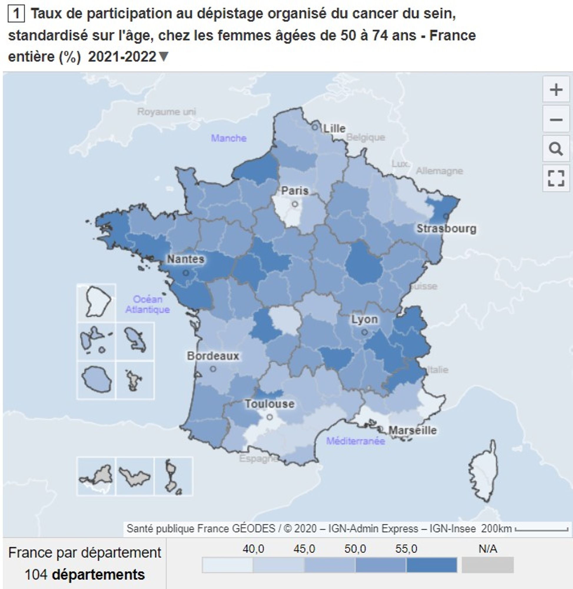 2 424 599 femmes ont effectué une mammographie de dépistage organisé au cours de l’année 2022, ce qui correspond à un taux national de participation de 44,9% (versus 50,6% en 2021).