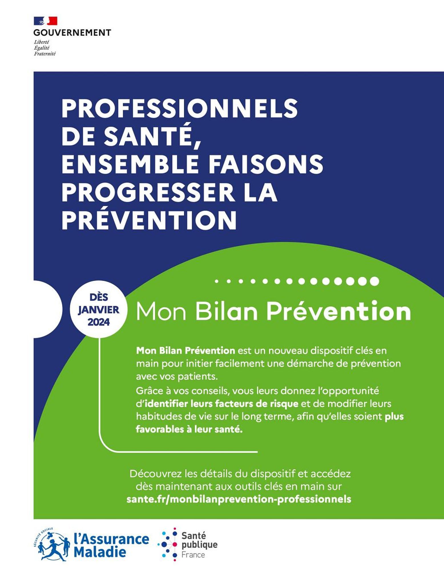 Mon bilan prévention est un rendez-vous permettant aux patients et aux professionnels de santé d’aborder les habitudes de vie, d’identifier des facteurs de risque de maladies chroniques (diabète, maladies cardiovasculaires…), réaliser des dépistages (cancers, IST…) et des rappels de vaccination.