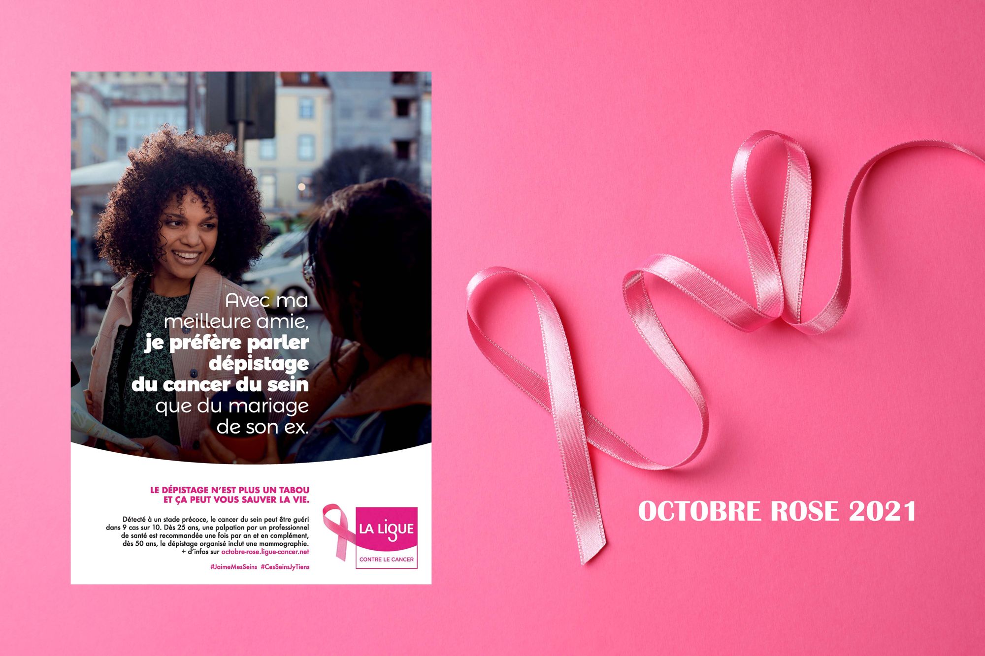 A l’occasion d’Octobre Rose 2021, la Ligue contre le cancer organise, dans l’Hexagone, en Corse et en Outre-mer, de nombreuses opérations de sensibilisation, de mobilisation et d’informations, dont une nouvelle campagne d’affichage .
