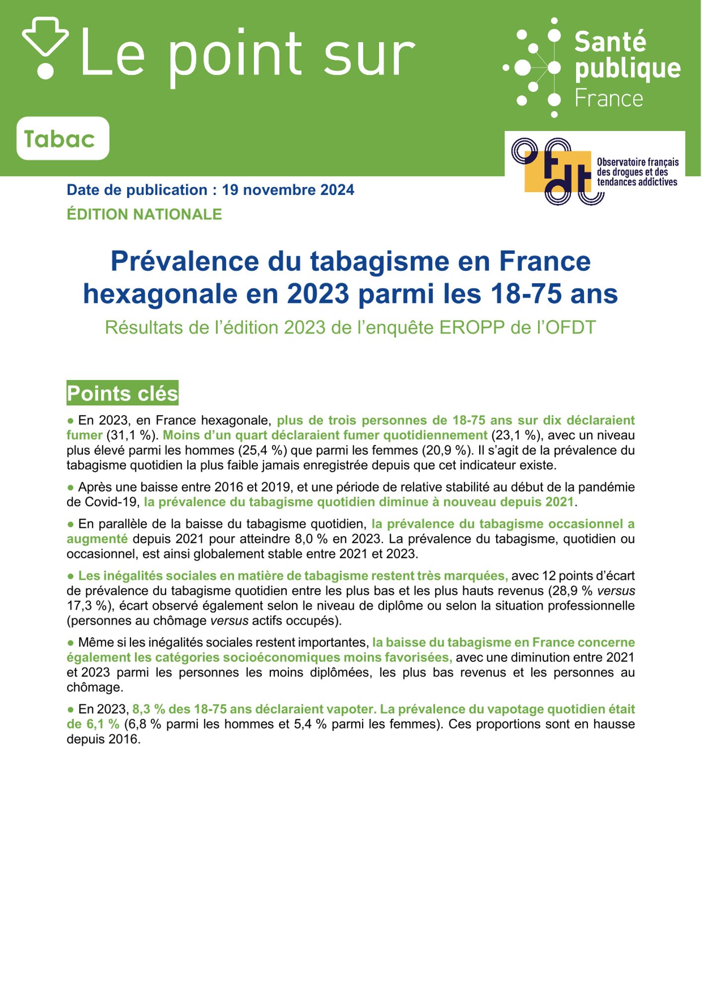 - En 2023, 8,3 % des 18-75 ans déclaraient vapoter. La prévalence du vapotage quotidien était de 6,1 % (6,8 % parmi les hommes et 5,4 % parmi les femmes). Ces proportions sont en hausse depuis 2016. (Résumé éditeur)