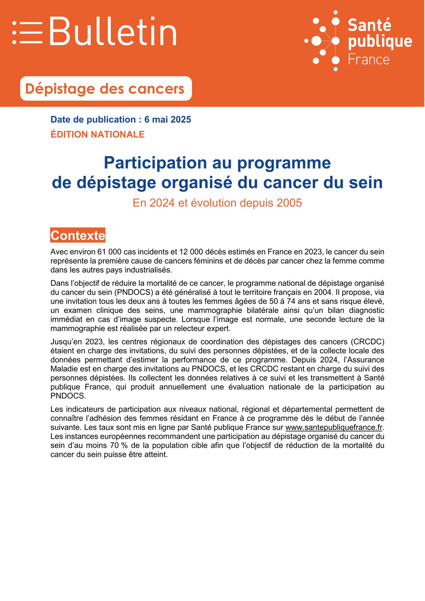 Programme de dépistage organisé du cancer du sein en 2024 et évolution depuis 2005