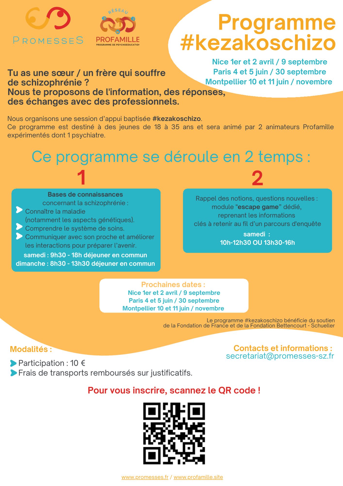 Le réseau Profamille et l'association Promesses proposent aux frères et soeurs de 18 à 35 ans, d'un proche souffrant de schizophrénie, le Programme #KEZAKOSCHIZO.