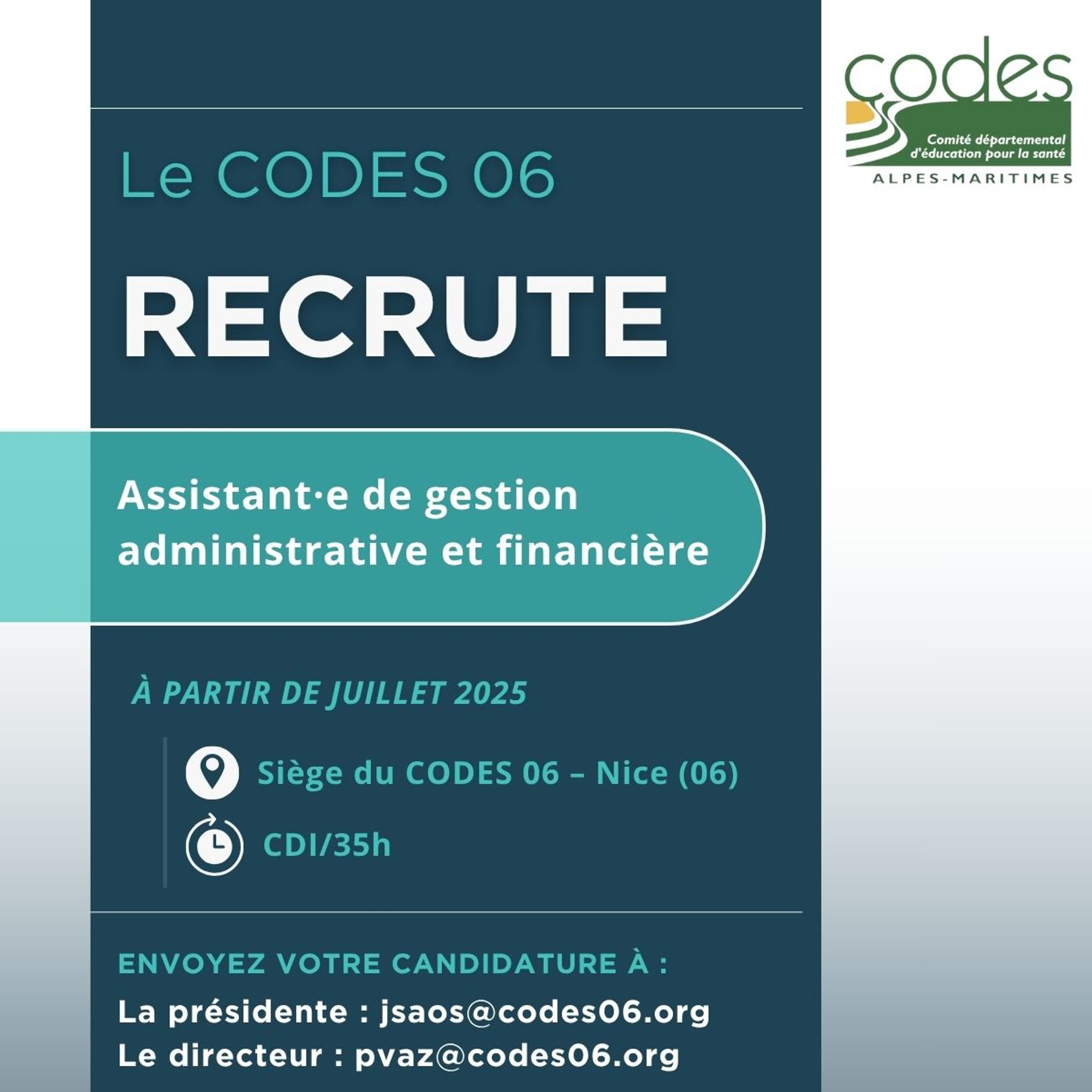 Le CODES 06 recrute un·e assistant·e de gestion administrative et financière