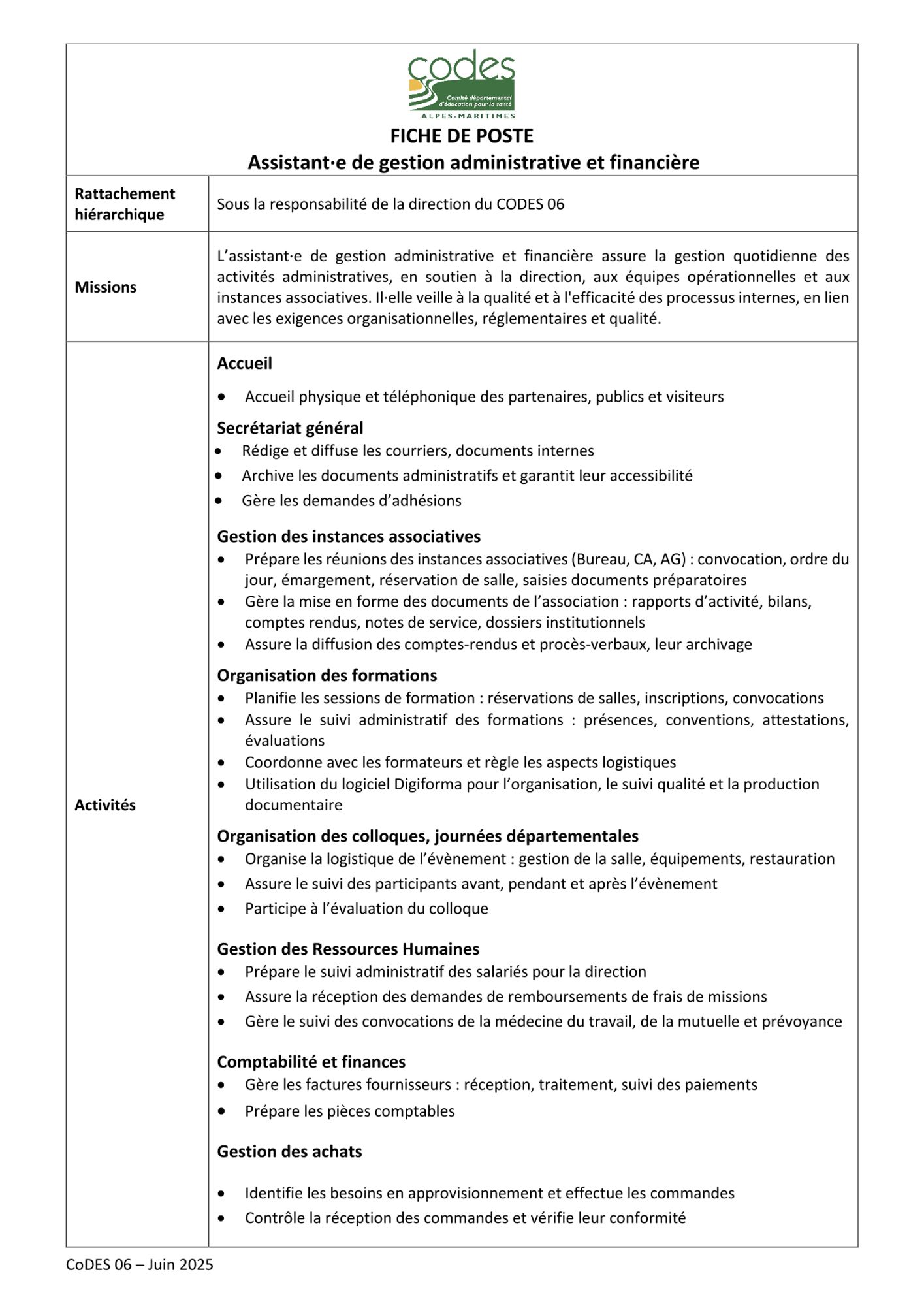 Sous la responsabilité de la direction du CODES 06, l’assistant·e de gestion administrative et financière assure la gestion quotidienne des activités administratives, en soutien à la direction, aux équipes opérationnelles et aux instances associatives. Il·elle veille à la qualité et à l'efficacité des processus internes, en lien avec les exigences organisationnelles, réglementaires et qualité.