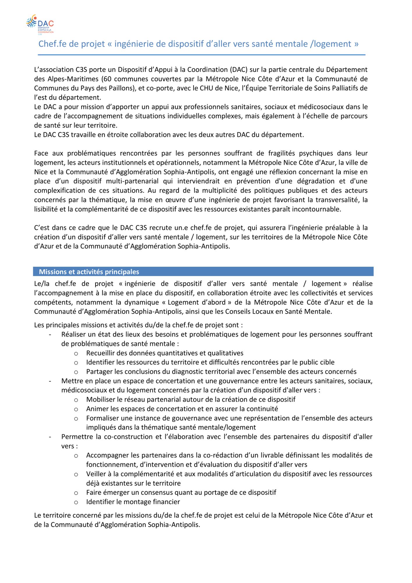 C’est dans ce cadre que le DAC C3S recrute un.e chef.fe de projet, qui assurera l’ingénierie préalable à la création d’un dispositif d’aller vers santé mentale / logement, sur les territoires de la Métropole Nice Côte d’Azur et de la Communauté d’Agglomération Sophia-Antipolis.