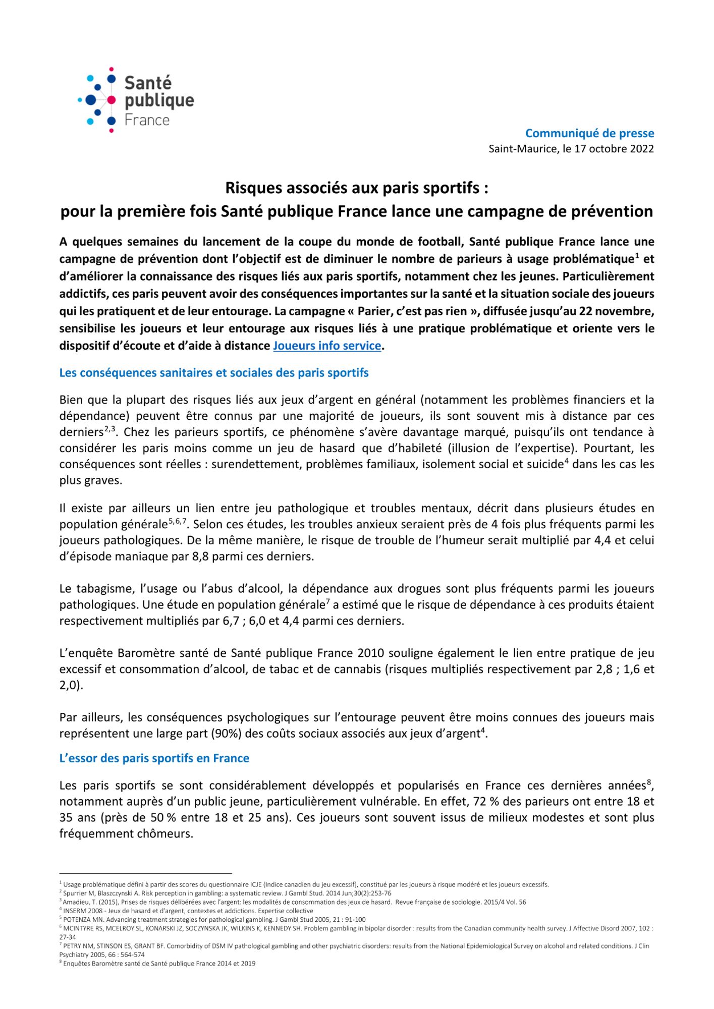 A quelques semaines du lancement de la coupe du monde de football, Santé publique France lance une campagne de prévention dont l’objectif est de diminuer le nombre de parieurs à usage problématique1 et d’améliorer la connaissance des risques liés aux paris sportifs, notamment chez les jeunes. Particulièrement addictifs, ces paris peuvent avoir des conséquences importantes sur la santé et la situation sociale des joueurs qui les pratiquent et de leur entourage. La campagne « Parier, c’est pas rien », diffusée jusqu’au 22 novembre, sensibilise les joueurs et leur entourage aux risques liés à une pratique problématique et oriente vers le dispositif d’écoute et d’aide à distance Joueurs info service.