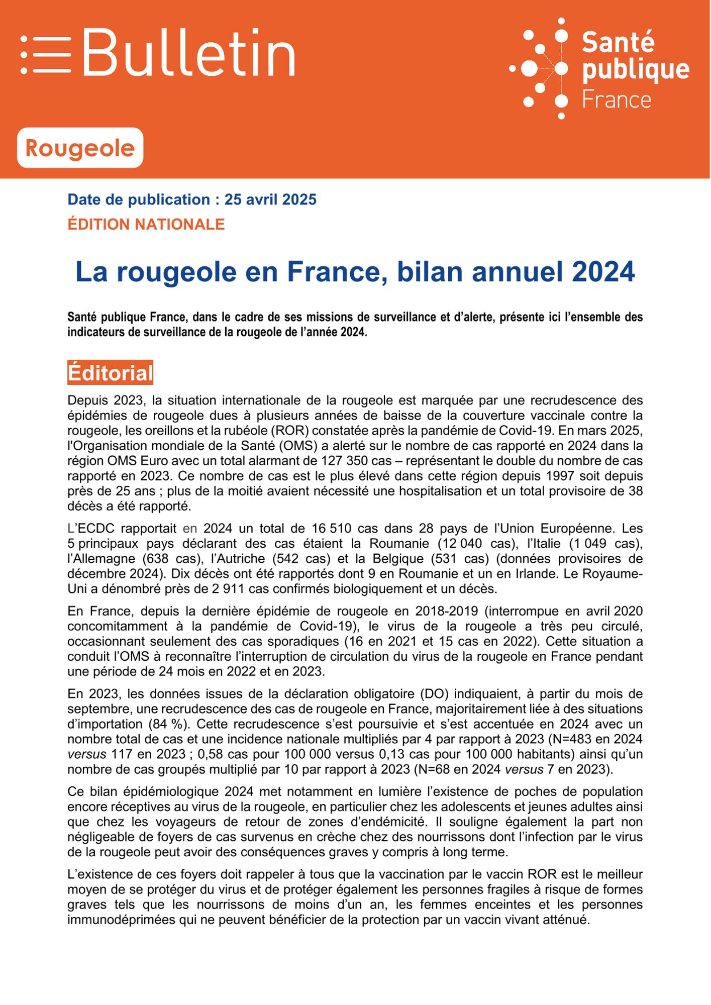 - Parmi les cas suspects de rougeole survenus entre le 1er janvier et le 31 décembre 2024, 483 cas de rougeole, dont 84 importés, ont été déclarés en France entière. Si le nombre de cas a été multiplié par 4 par rapport à 2023, il reste encore limité par rapport à la moyenne des années antérieures à la pandémie de COVID-19.