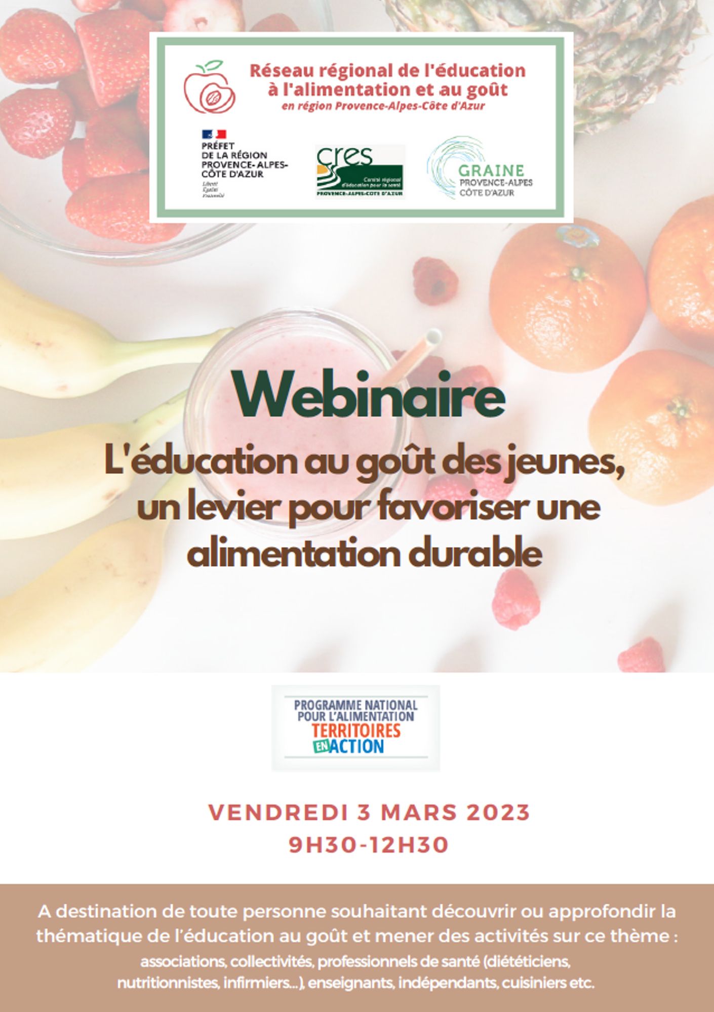 Ce webinaire est organisé dans le cadre du « Réseau régional de l’éducation à l’alimentation et au goût en région Provence-Alpes-Côte d’Azur », et s’adresse à toute personne souhaitant découvrir ou approfondir la thématique de l’éducation au goût et à l’alimentation durable, et mener des activités sur ce thème : associations, collectivités, professionnels de santé (diététiciens, nutritionnistes, infirmiers…), enseignants, indépendants, cuisiniers etc.