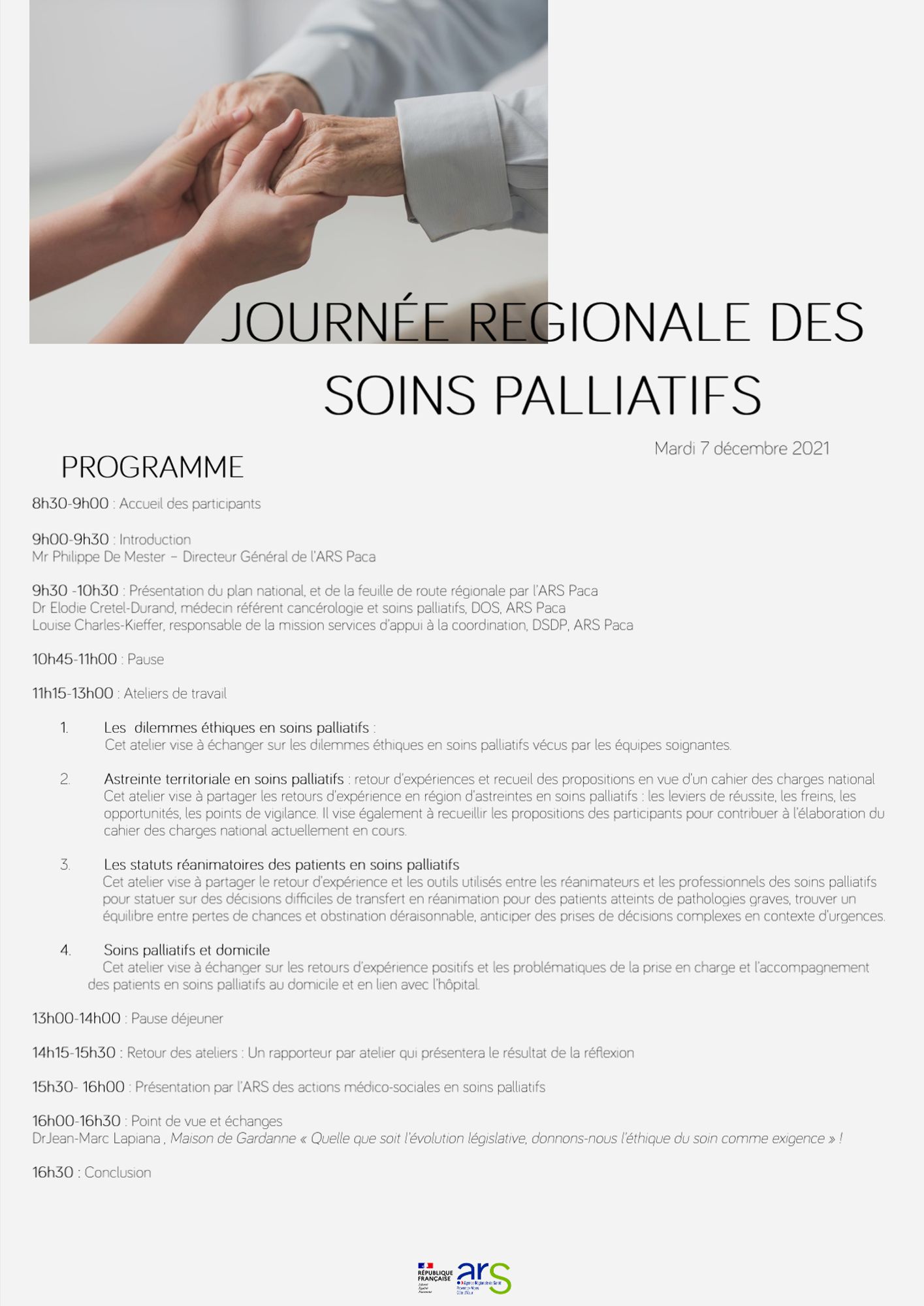 Dans le cadre du 5e plan national de soins palliatifs, et dans la poursuite des travaux engagés en région, l’Agence régionale de santé Provence- Alpes -Côte d’Azur (ARS Paca) organise le mardi 07 décembre 2021 à Marseille une réunion régionale autour du développement des soins palliatifs et de l’accompagnement de la fin de vie.