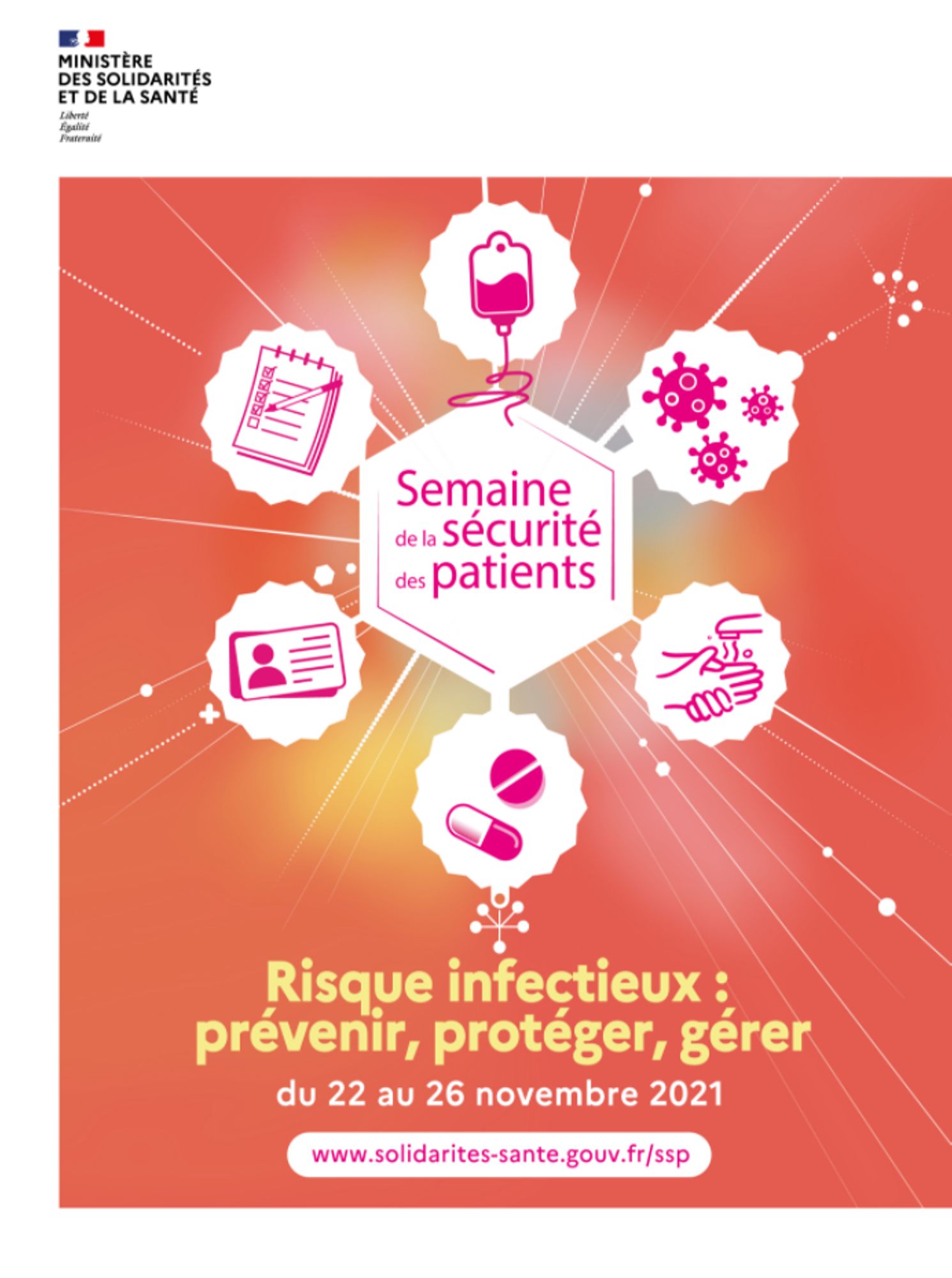 Opération annuelle de sensibilisation, la semaine de la sécurité des patients promeut depuis 12 ans un objectif fort : interpeler l’ensemble des publics sur les enjeux de la sécurité des soins et favoriser un dialogue entre usagers / patients et professionnels de santé et médico-sociaux. En 2021, la SSP sera organisée du 22 au 26 novembre sur le thème « Risque infectieux : prévenir, protéger.