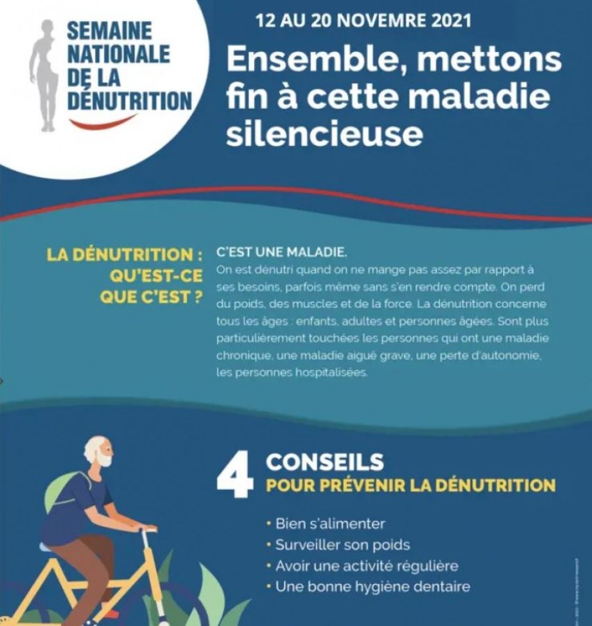 Semaine nationale de la dénutrition Du 12 au 20 novembre 2021 Vous aussi, devenez acteur de la #SemaineDénutrition2021 ! Vendredi 12 novembre 2021 Samedi 20 novembre 2021