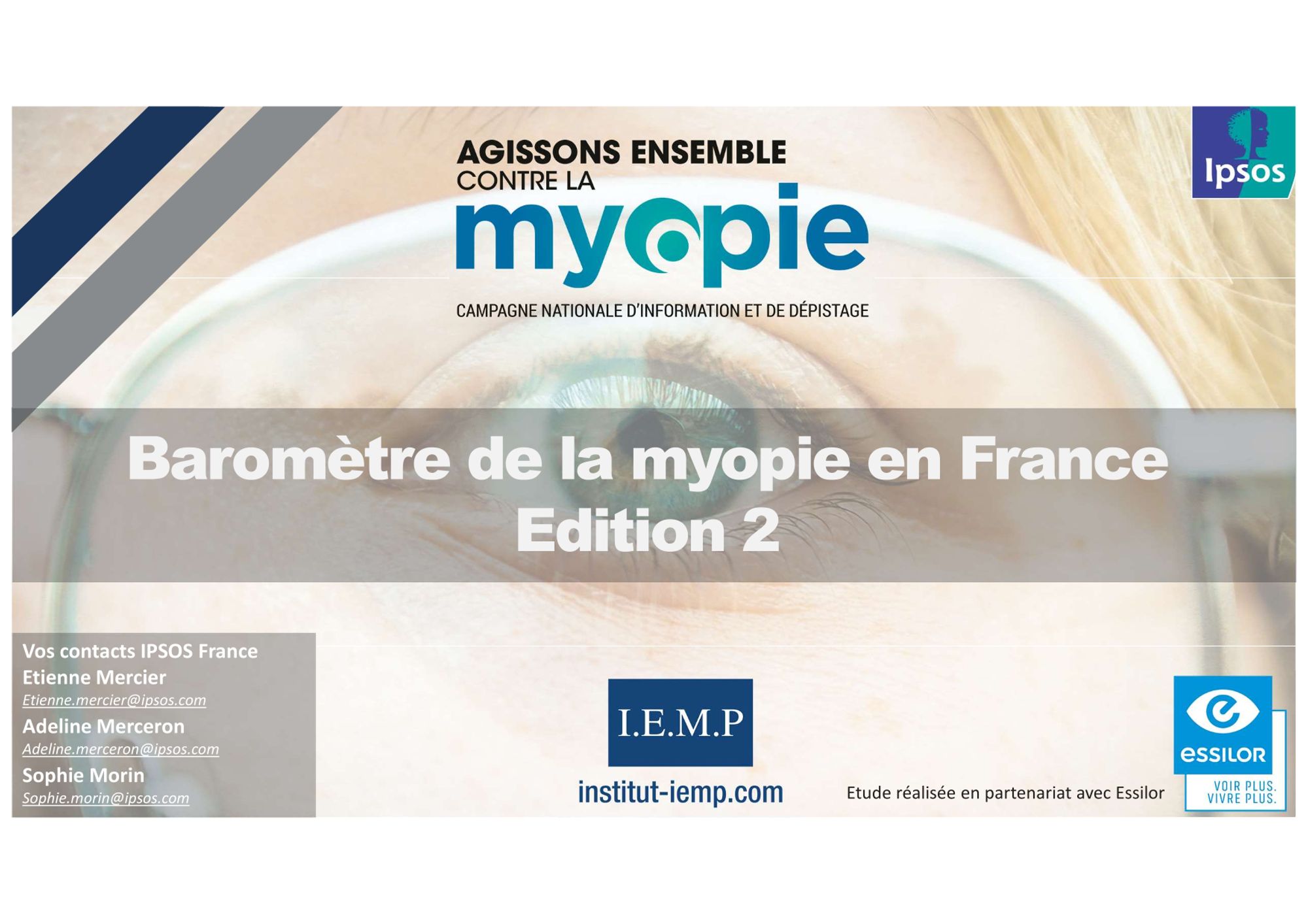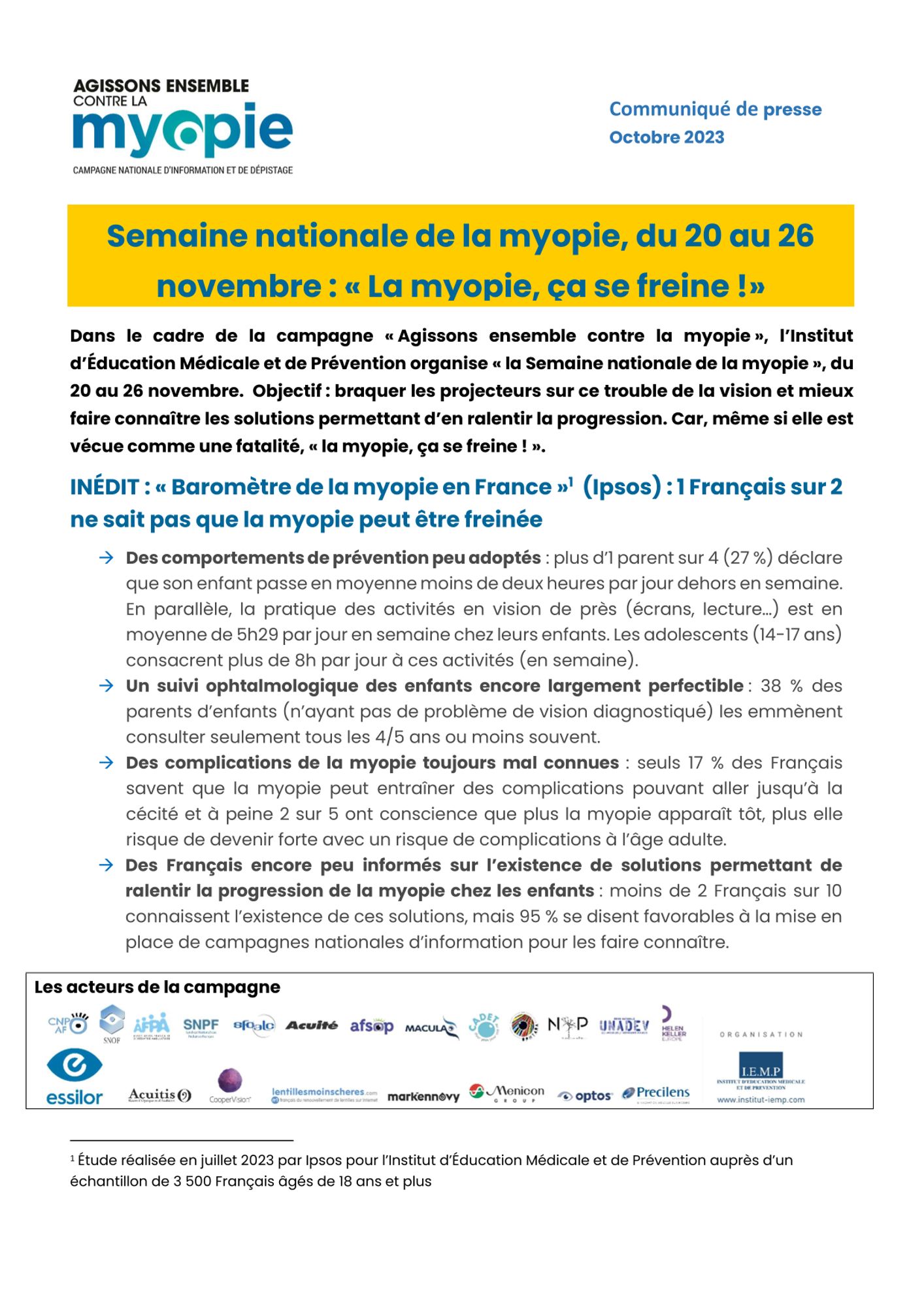 - l’implication des partenaires de la campagne : dépistages dans les écoles par l’association Helen Keller, animations chez les opticiens partenaires d’Essilor (dépistage visuel des familles, sensibilisation sur les verres de freination…) et de Coopervision, campagne de sensibilisation menée par les maisons Acuitis sur le sujet de la myopie évolutive et les solutions pour en ralentir la progression.