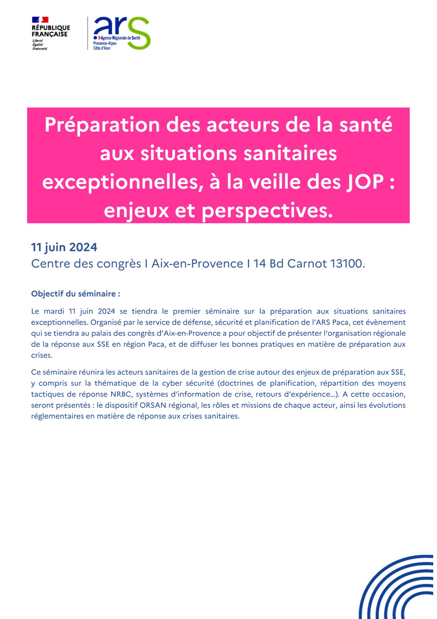 Alors que la Région Sud se prépare à accueillir les épreuves des Jeux Olympiques et le Tour de France cet été, l' ARS Paca organise un séminaire régional sur le thème des situations sanitaires exceptionnelles (SSE) le 11 juin 2024.